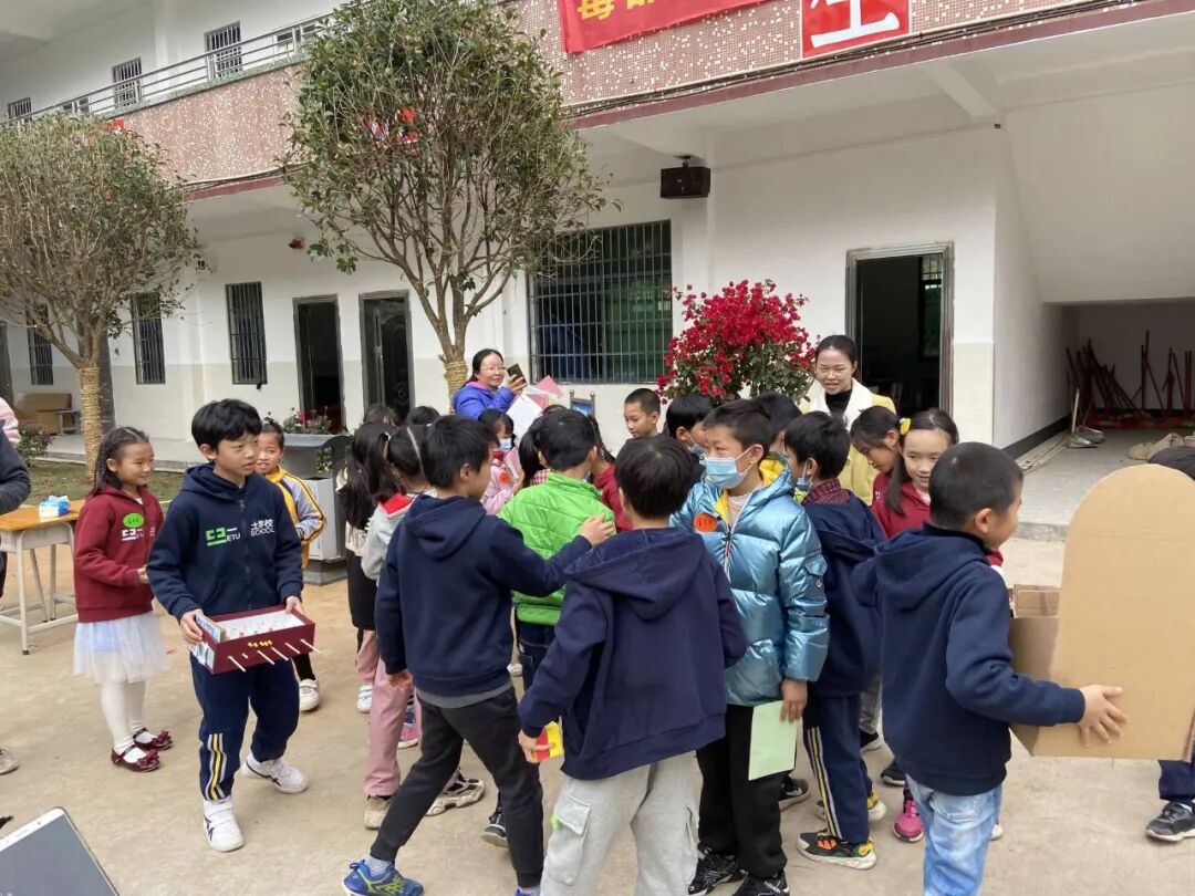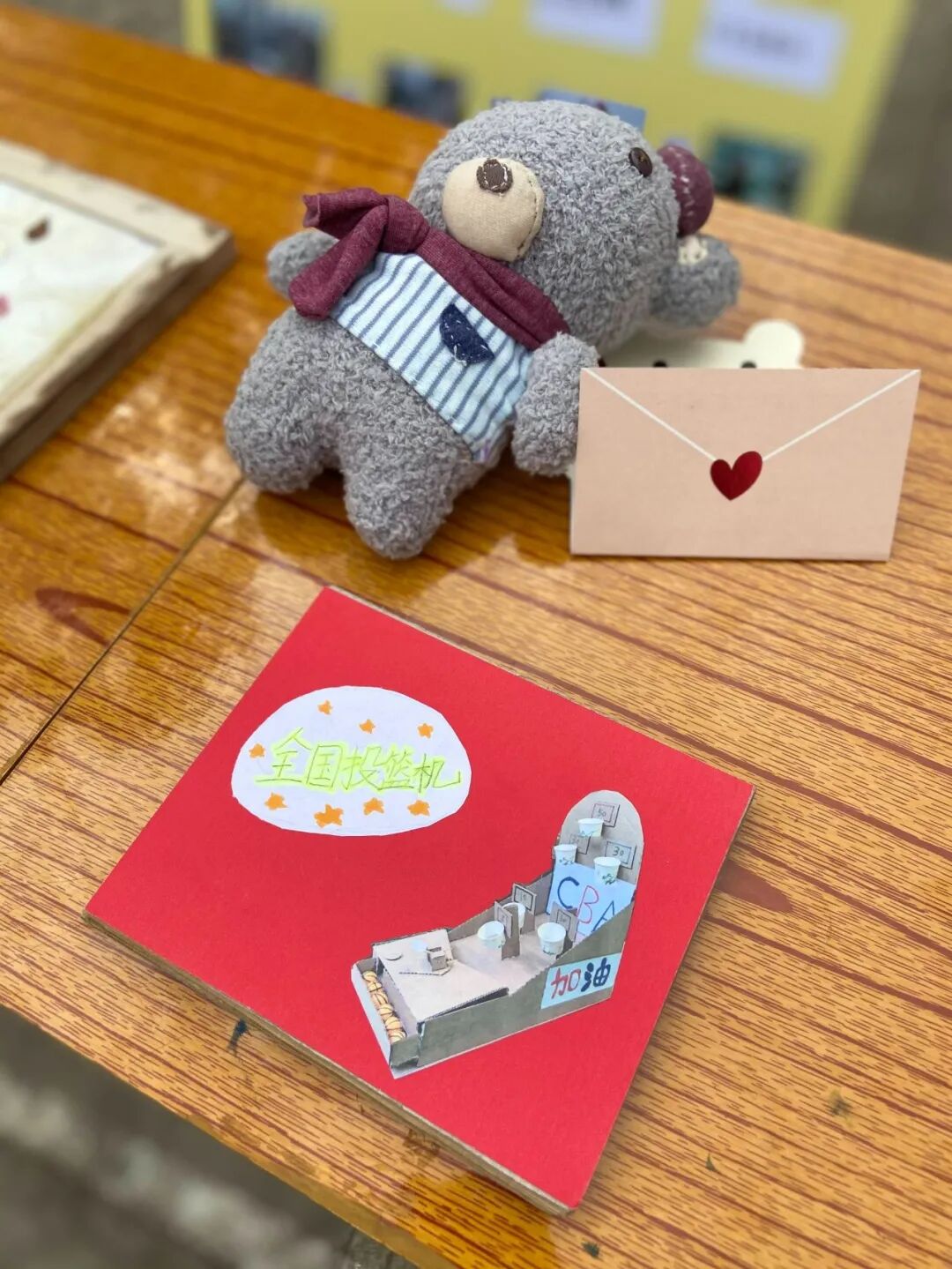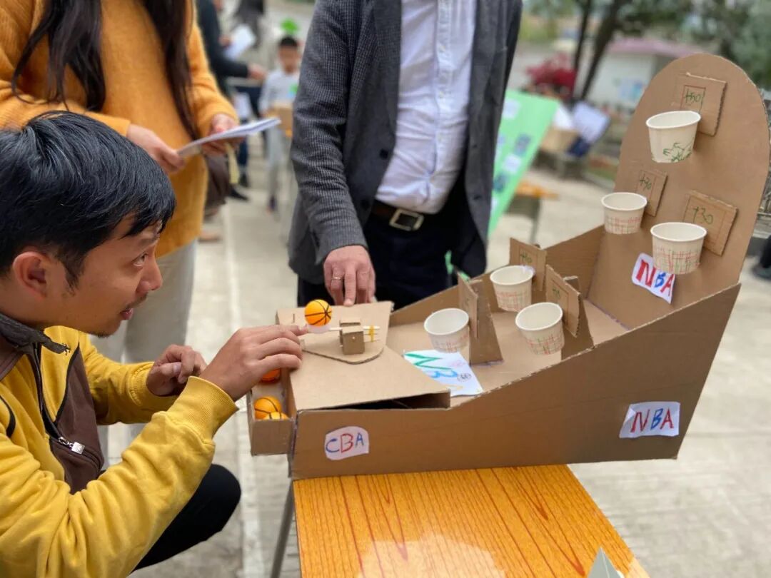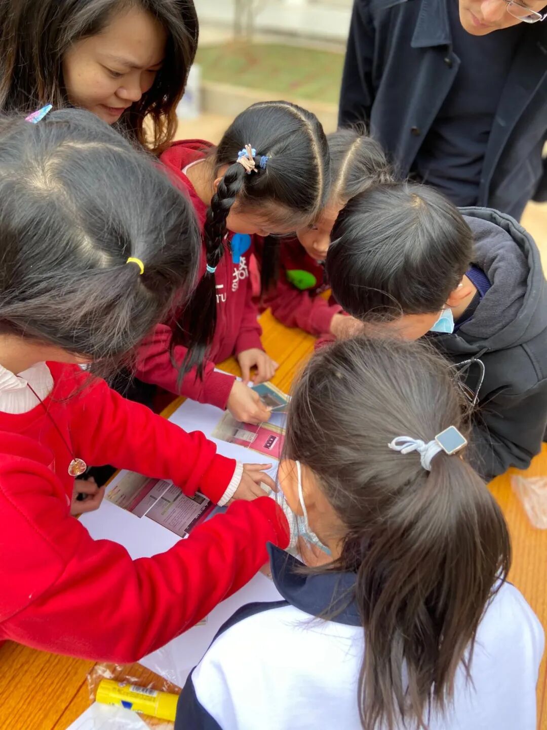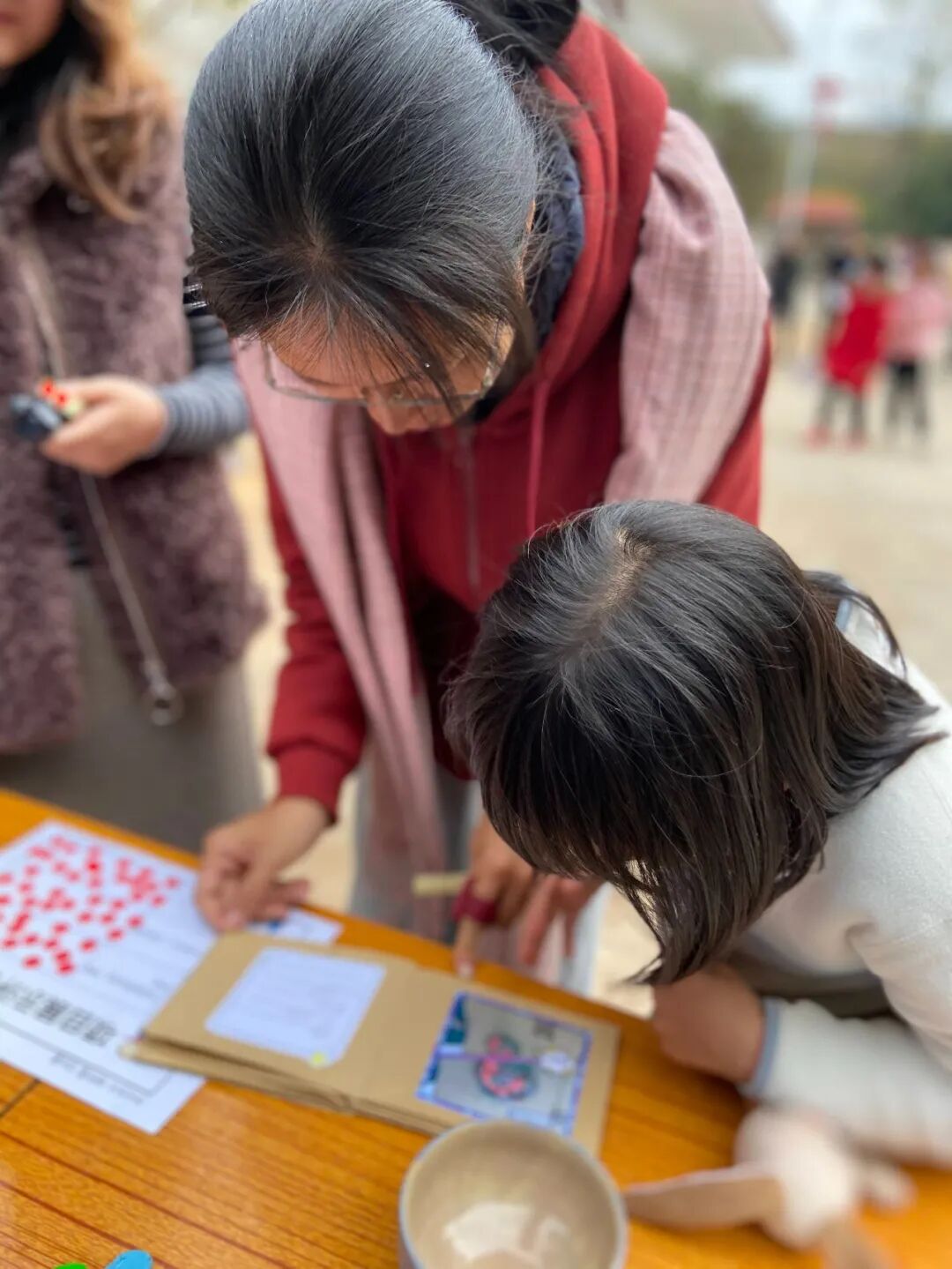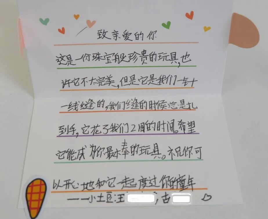▲两人一组合作的毛绒玩具赠送留言卡——“致亲爱的你,这是一份珠宝般珍贵的玩具,也许它不太完美,但是它是我们一针一线缝的,我们缝的时候总是扎到手,它花了我们2周的时间。希望它能成为你最棒的玩具。祝你可以开心地和它一起度过你的童年。”也许对于PBL来说,最大的”坑“就是老师们努力去让整个项目与真实生活产生链接。如果研究了一学期100课时的东西,仅仅停留在自嗨状态,没有让更多的人看到、感受到、评价到,孩子们对解决实际问题的冲动不一定能持续蓄势待发。这次的项目展示日,也是广州一土历史上史无前例地跑出城。家长和孩子们利用一个周六,一起租车开了三个小时来到了广东河源连坪县新镇小学,在新镇小学的操场上支起了个人展位,把自己亲手设计制作的玩具赠送给了新镇小学的孩子,和他们一起玩拼图游戏、拔河游戏,新镇小学的孩子们玩着那些玩具时脸上浮起的笑容应该就是这个项目最完美的注脚了。