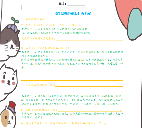“坑”挖到这里,时时不忘教学目标的老师适时地将他们的口语表达进一步推进为写作训练,你已经这么精彩地分享了自己最棒的玩具,能不能写一写它呀?孩子们不再觉得这是一个“为赋新词强编话”的硬性任务了,脑海里已经有了一些想法和对写作对象的基本情感。“坑”有了,跳进去了,还要给他们梯子!基于他们的分享,老师总结了一些这篇作文可能需要提及的内容,先通过学习单的形式让孩子们思考这些基本问题 “我最棒的玩具是什么?”“它是怎么来的?”“为什么是我最棒的玩具?”……