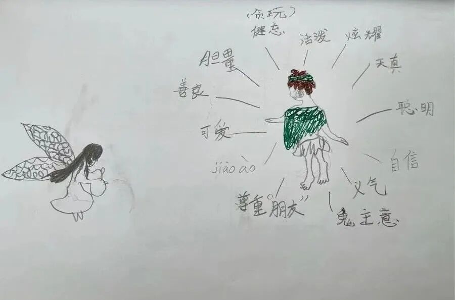 有了对《长袜子皮皮》的总结经验,孩子们明显对人物特点把握得更精准了。首先,彼得潘聪明、善良、讲义气,跟心狠手辣、道貌岸然的胡克产生了鲜明的对比。紧接着,孩子们从书中找证据,又发现彼得潘幽默、骄傲、活泼、爱炫耀等等特点,彼得潘的形象越来越立体。孩子们一致觉得彼得潘还特别童真,有不少鬼主意,勇敢无比!