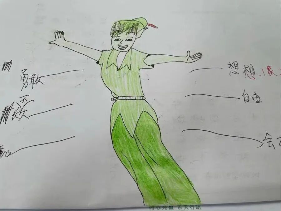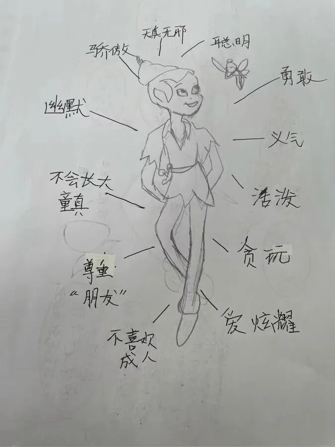 那么在这些討论的基础上,皮皮的性格特点也跃然纸上。值得一提的是,刚开始孩子们在寒假完成这份人物卡的时候会把皮皮的外表特点与性格特点混淆,经过一节课的討论,我们也清晰了何为性格特点。第二节课,我们开了一场辩论赛:你喜欢皮皮吗?你想成为像皮皮这样的人吗?● 我想成为像皮皮这样的人,因为我想学习皮皮身上的优点,例如她的勇敢,现实生活中我连黑房间都害怕,所以我希望能像她一样勇敢。● 我想像皮皮一样拥有丰富的想象力,如果没有想象力的话,看房子就是普通的房子,可是如果想象力丰富的人可能会把这座房子想象成一座乐园,让自己的生活充满乐趣。最后总结性发言:我们想成为皮皮,想成为彼得潘,想成为夏洛,甚至想成为路上看到的好的人,只是因为我们想去学习别人的优点,成为更好的自己。● 尽管皮皮拥有财富,但她没有基本的礼仪,这样会让周围的人非常反感;没有礼仪不顾及别人的感受,那就是没道德。我不想成为这样的人。● 皮皮如果一直都是这样,她长大以后也没有办法找到工作,而且她错过了学习的最好机会……之后双方进行了激烈的自由辩论(我提炼了孩子们的交锋):● 善恶有分还是事情只分立场不分善恶?(这个话题处理不当其实挺危险的,但孩子们既然提到了,就需要去澄清。最后我们认为无论如何是要“向善”的。)有关于完美的討论:想成为皮皮是否是成为百分之百的皮皮?是否要考虑皮皮长大以后社会化的事情?孩子们唇枪舌战,能清晰地表达和输出自己的观点,尝试回应和让对方接受自己的观点。在这样的辩论中,孩子们真实的想法和个性呈现出来,在碰撞中,学会倾听、理解。皮皮不是一个现实生活中存在的人,她更像是一种精神原型,折射的是不同儿童的样貌。不同的人,在皮皮身上,也许能看到自己的影子,自己的独特。也有可能镜像原理,看到自己缺少的部分。孩子们读经典的儿童文学,从而使自己的精神得以成长。在晨读的时候,我们一起分享了《彼得潘》里的精彩段落,上课的过程中又通过给出的图片唤醒了孩子们的阅读记忆。同学们共同梳理了书中的人物和故事发生的主要地点。在梳理的过程中,我们聚焦了彼得潘这个主要人物的特点。