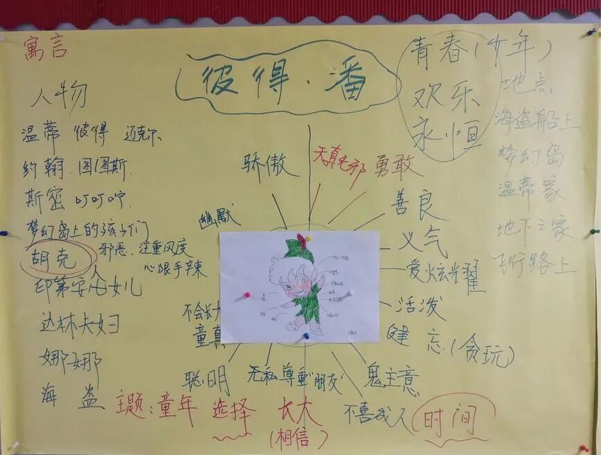彼得潘的形象在课堂讨论的过程中鲜活了起来。同样,同学们在总结彼得潘的特点的时候,也不自然而然地把他(她)自己的特点或愿望,投射到主人公的身上,这是又一次在阅读中找到了“自己“。最让人惊喜的是“总结主题”环节,孩子们总结出“童年”、“选择”,“长大”尚在我的意料之内;但孩子们还说“时间”应该是一个主题,让我惊讶于他们细腻的发现与深入的思考。是的,在彼得潘与成人世界之间,还隐藏着一个巨大的分歧,那就是对待时间的态度。