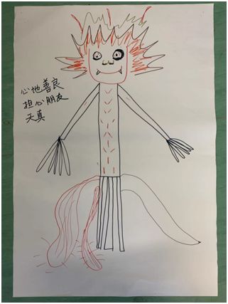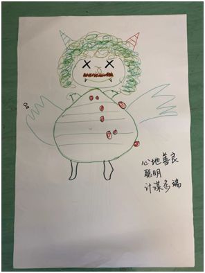 ▲孩子们跟着小音箱里跌宕起伏的故事情节,用画笔描绘着,故事主人公画像便在孩子们的笔下生成。图为小土豆们创作的红鬼和青鬼图片。