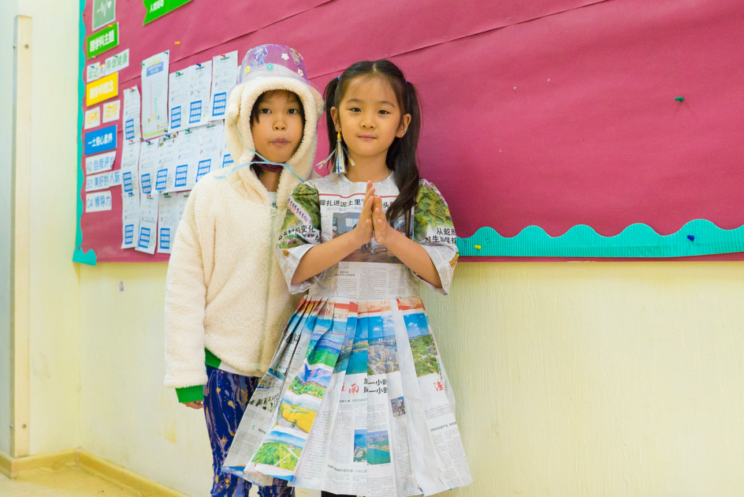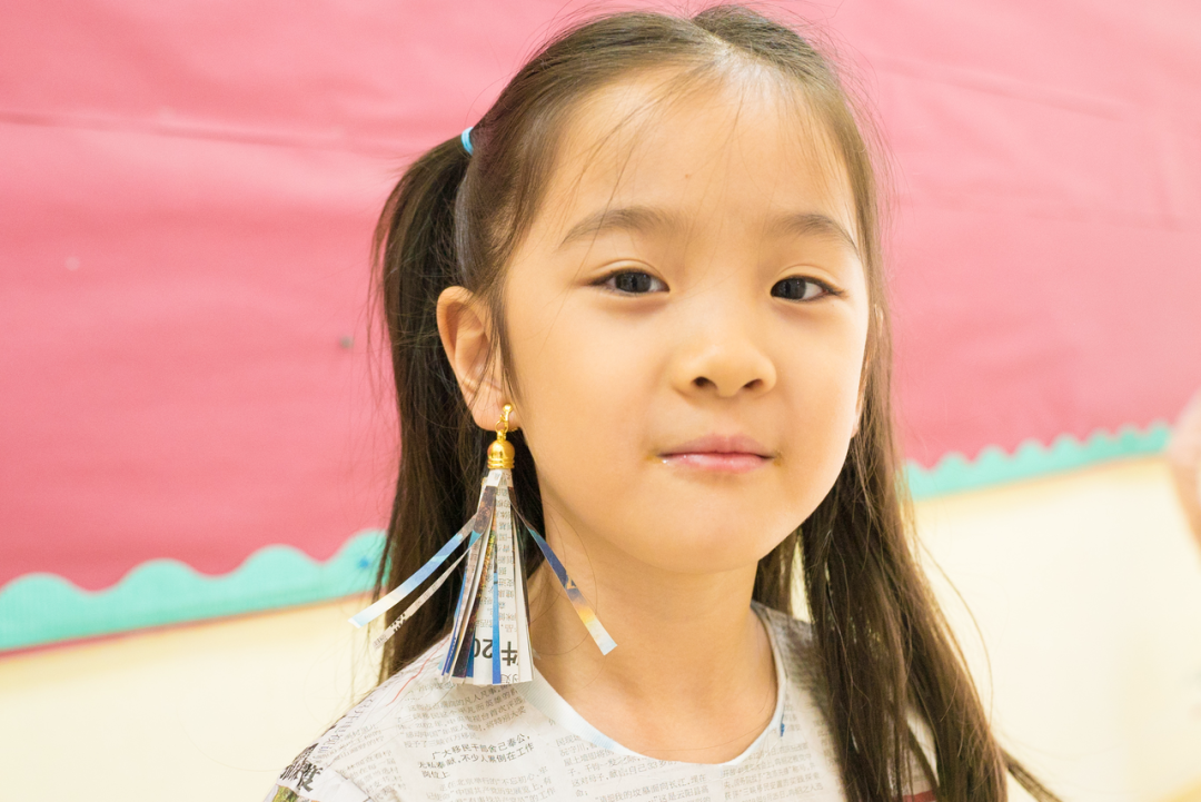 ▲ 环保日,小土豆用报纸做了衣服和耳环