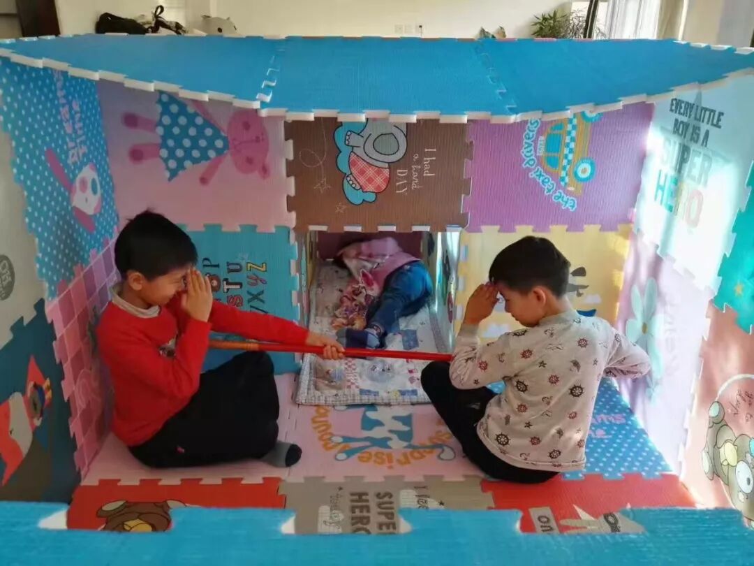 ▲仨孩子拿地垫搭的“城堡”,然后自导自演的戏。