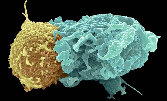 ▲T淋巴细胞(左)正在攻击一个受感染细胞(右), 扫描电镜照片,后期上色http://www.researchmagazine.lu.se/2016/05/16/do-migratory-birds-have-a-better-immune-system/