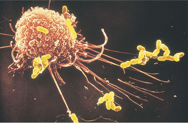 当病菌通过皮肤的伤口或穿过黏膜进入体内,第二道防线就要发挥作用了。这时我们身体内的警察——各种白细胞会尽量识别并攻击入侵者。例如其中的代表,巨噬细胞,会毫不留情的将入侵者吞掉。但警察们的行动并不总是及时的,有时在它们发现情况的时候病菌已经繁殖扩散。这时候大量的细胞警察会应召赶到事发地点投入战斗。白细胞呼唤支援的方式是分泌一些化学物质。这些物质随血液流遍全身,因此即使是局部的感染也会有全身的反应。比如在重感冒的时候人们往往感觉浑身乏力酸疼,这是因为白细胞分泌的物质会使神经末梢敏感,并以这种方式提醒身体要减少活动,节省能量以对抗感染。另外我们的身体还会获得体温上升的信号,用高温抑制病毒繁殖。这些细胞警察解决问题的方式简单粗暴,例如天然杀伤细胞(natural killer cell)探测到被感染的细胞就释放毒素予以毁灭。但这种无差别攻击常常伤及无辜,周围的正常细胞也会大量受损。实际上这种伤敌一千自损八百的战术往往比入侵者本身造成的伤害还要大。2003年的SARS和此次疫情都是如此,真正造成患者严重肺部损伤的是免疫系统的过度反应。要想真正取得这场战役的胜利,身体需要调动最后的防线。