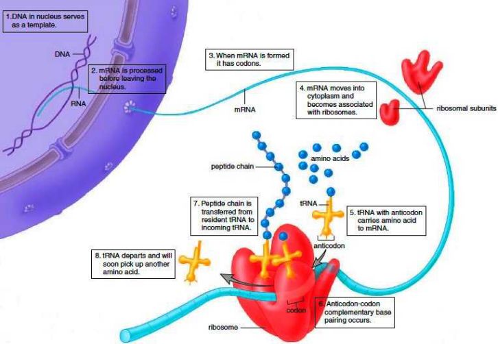 另一种遗传物质是RNA(核糖核酸),一种和DNA很相似的大分子。RNA与DNA使用几乎一样的编码方式,并遵循相同的配对原则。因此,DNA和RNA分子可以互为模板合成对方。但与DNA的稳定不同,RNA分子相对活泼,因此并不太适合于稳定储存遗传信息,但却可以携带着信息与其它分子进行相互作用。在生物细胞中,DNA中的一段一段的遗传信息(也就是我们通常说的基因,gene)会根据互补配对的原则被抄录(生物学上被称为转录,transcription)为一小段一小段的RNA序列(被称为信使RNA,mRNA),并被送至细胞质中进行信息的表达,即合成蛋白质。我们说过蛋白质就像由乐高积木拼成的机器,而且积木的种类大概有20种。因此,要根据用核酸四进制语言书写的蓝图用20种积木进行拼装就需要一个翻译(translation)的过程。承担翻译工作的也是一种RNA分子(转运RNA,tRNA)。这种形如三叶草的分子一端可以利用互补配对原则读取mRNA上的序列,一端可以根据序列连接特定的氨基酸(也就是组成蛋白质的乐高积木),进而形成由氨基酸排列形成的串珠,最终折叠成特定结构,形成有功能的蛋白质。这一过程需要在一个小小的工厂内进行。这种由蛋白质和另一种RNA分子构成的蛋白质工厂被称为核糖体(ribosome)。和DNA的复制一样,根据DNA序列表达为蛋白质的过程也十分复杂且十分耗能。(过程如下图所示)