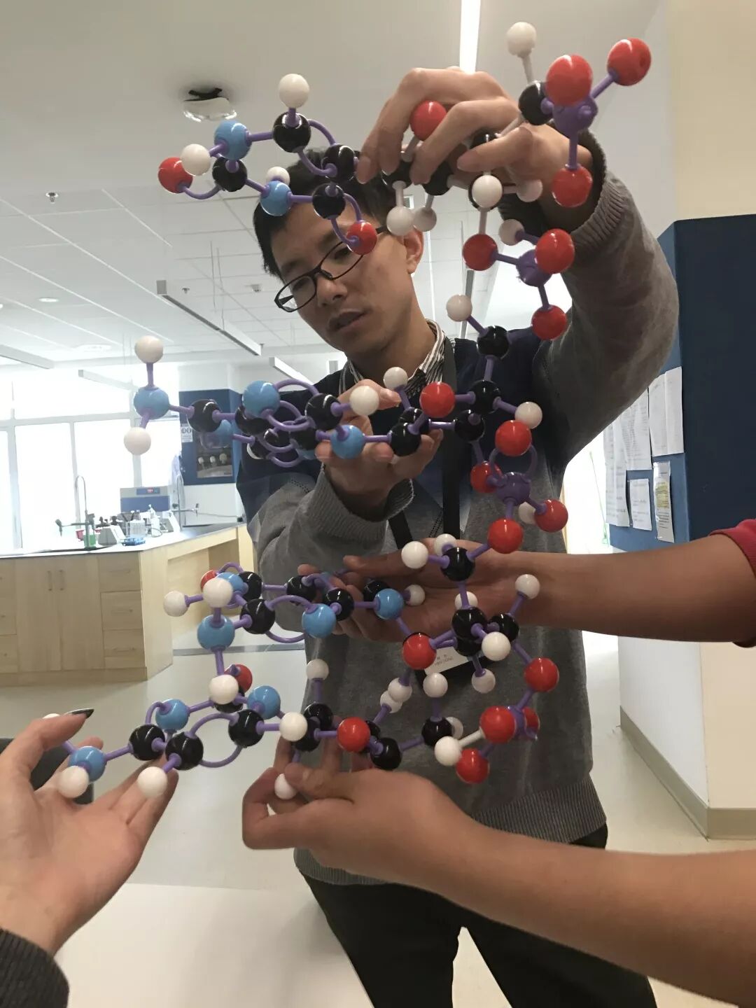 题图:作者展示学生在课上组装的DNA模型。