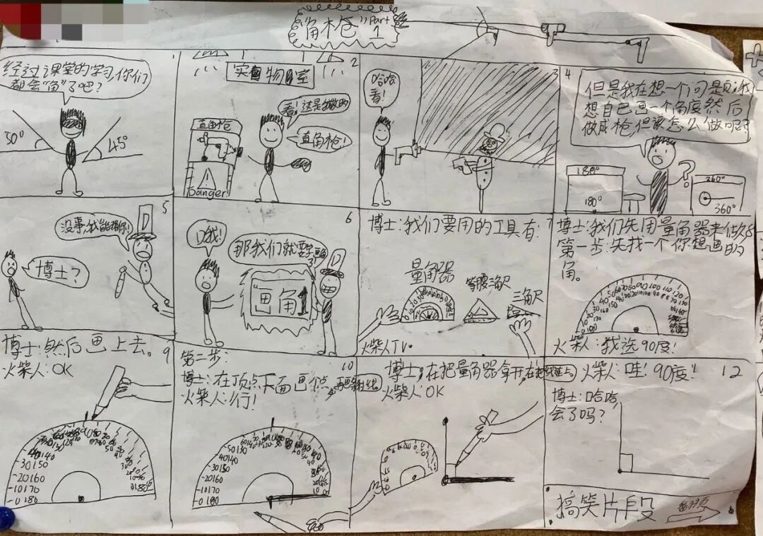 戏剧课是一土的校本课程,每个学期末还会有戏剧节,看着舞台上孩子们绽放的表演,似乎是对童年与成长最好的见证。跃跃这些年也和老师及同学们一起共创了好几个原创作品,从第一年的《猫鼠大战》里的一只小老鼠、到《蜻蜓班的足球村》里一个普通村民、从《窗边的小豆豆》里小豆豆的同学,到《爱心树》中小男孩童年时的玩伴,跃跃这个“打酱油”的,把自己并不多的戏份,演绎的无比舒展。每到这时,看着台上的他,用洪亮的嗓音,夸张的表情来去演绎他的每一个角色,以及看着班里最淘气的孩子也全然沉浸于其中的精彩表演,我都总会忍不住泪目。孩子都是渴望被看见、被欣赏的,而每一个孩子都值得被看见。前两天下学,孩子很高兴地跟我汇报,“妈妈,跑了4年龙套,今年我们班的戏剧我终于要扮演主角了!”虽然孩子们的戏里其实没有绝对主角, 但跃跃的幸福与自豪感溢于言表。看着对这次演出充满无比期待的他,我和他爸不禁说了一声,“真是个内心充盈的小孩儿!”总的来说,这些年,跃跃这颗小苗,在一土这块有机田里健康而自由地长大了。因为被老师与小伙伴看见,所以让跃跃得到了更多的热反馈;因为得到热反馈,让他更勇于去表达;因为更勇于去表达和行动,让他变的更加自信,学习也更主动与积极。希望这个正循环,让他能在自我驱动下的学习与自我管理中,越走越远。在围绕教育的讨论与辩论中,总习惯性地将创新教育与应试能力对立化,似乎创新教育里长大的孩子注定就是不能应试的。从何开始,我们将教育这个让人成为人,一个灵魂唤醒另一个灵魂的过程,简单粗暴地理解为只是为了应试?我觉得,可能首先要让给把考试作为一种检验孩子是否掌握了所学知识的方法和途径,与在刷题中被动培养的应试能力区分开来。教育不等于应试,至少我不希望孩子还在小学的时候,就将所有的注意力都聚焦在分数上,为了那几分,将原本可以发展自己个人兴趣、阅读、甚至体育锻炼的时间,来刷题。一土从来都有考试,孩子们也毫不排斥考试,语文有朗读、阅读、写作、写字等各方面的测试,数学有考卷,英文有MAP测试和口语测试等等。考试形式也不再是一张试卷定乾坤,有师评和自评,有的时候,根据平时孩子们提交作业的情况,以及课堂是否积极参与等多方面表现,还能从老师那里申请免考特权。考试的结果,对于低年级的孩子更多是AB等级制,而不是百分制,并且每个孩子还会有机会对第一次考试的结果进行自我纠正与迭代。如今到了高年级,因为多样化的评估方式,孩子的考试有时候可以长达两周。前一段期中考,跃跃语文考试中的百字测试考了95, 错了5个字,数学考了98,错了一个小题。虽然老师依旧是在试卷上给了等级评定,但孩子们竟然开始自己给自己算分… “我现在都会自己检查纠正了!老师说我比上学期又进步了,上学期我的百字只得了80多!”跃跃这样评价自己这次的表现。我个人觉得挺好,毕竟,考试的目的不在于和他人去比较,而是对自己这一阶段学习成果的检视,从而能让老师的教与孩子的学更具针对性。这次考试,孩子给我的真正的惊喜,其实是他在考前积极主动的自主复习。考试前一晚,他在过完上半学期的核心知识点后,用A4纸制作了一张张数学语文的“知识卡片”,据说老师第二天还当着全班分享了他的“创新”。真是应了教育者们常说的那句话,每一个孩子是天生的学习者,我们需要做的,就是相信,和足够放权。这个学期以来,跃跃在作业上花费的时间的确多了不少,我很好奇地看了一下他们的作业都是啥?不得不说,四年级的作业,不容易。这个不容易,不是重复的题海战术,更多的是让孩子学会对知识的总结、归纳和迁移,是基于理解的输出。前一段时间,孩子们学习《中国神话故事》及《希腊神话》。语文作业除了常规的作业,还需要每个孩子选择其中一个神话人物,制作人物名片,同时写一篇《我与XXX的一天》,还围绕这个主题,让孩子们策划一个真人博物馆。跃跃选的是战神阿瑞斯,晚上他在家里还鼓捣了半天,剪剪贴贴,后来用纸做出了战神的头盔和铠甲,有模有样!后来,听说他的团队小伙伴还用Mine Craft的模组,做了一个战神的角色,创造了一个“虚无世界”,孩子还给游戏配了音,讲解了战神阿瑞斯的性格、特点和故事。前两天数学课,为了让孩子自我总结“角”这个单元的学习,老师布置的作业是“用角创作一幅漫画”。跃跃是唱着歌做完的这个作业,而且还一连画了两幅,叫做“角枪”的故事,里面把对角、顶点、射线,以及如何度量角的度数用漫画的方式讲述的清晰完整。