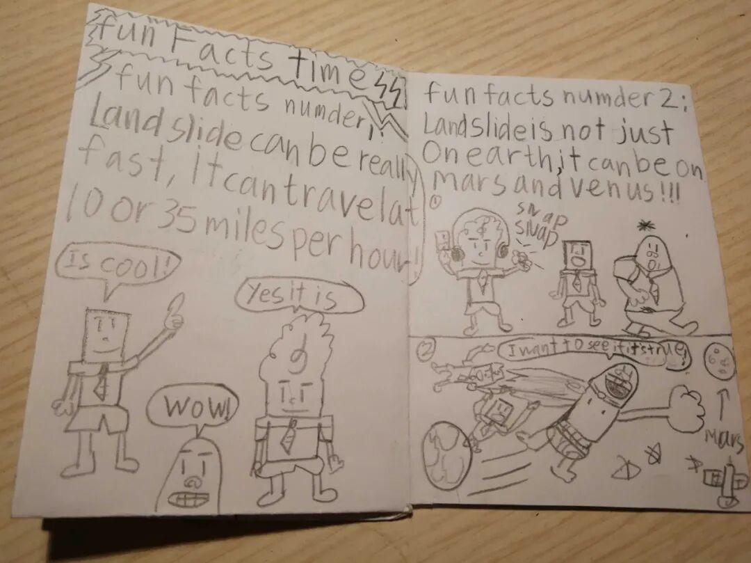 还有一次,英文课里孩子们学习了“自然灾害”的主题,老师们让孩子们将一张A4纸叠成一个八折页的小册子,让孩子们选择一个自然灾害的主题,来做一个知识小册子。结果,跃跃花了一个多小时,用他最爱的Captain Underpants 的人物,创造了一个landslide comic book漫画书。里面是憨态可掬的的George and Harrold,以及那个打一个响指就可以瞬间从刻薄的校长变身英雄内裤队长的Mr. Krupp.