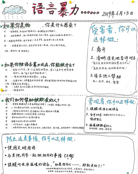 在广州一土,班主任禀持的原则是听正确的观点,保证每个人的声音可以被听到;对事不对人,以解决问题为导向;在解决班级问题或制定规则时尽量采取投票,鼓励充分表达,并及时肯定有价值的观点;班级工作或活动尽可能公平轮流,使每个孩子有机会去锻炼自我。在广州一土,一个真实的班级文化氛围建立前提是教师自己充分打开自己,愿意向学生展示真实的一面,而打开的前提是接纳自己;接纳每个孩子,看到经历与家庭对孩子的影响;创设真实的情境,提供表达机会,让学生学会彼此尊重;肯定真实的表达。▲半年前,广州一土一年级的老师就同学间突发的语言暴力事件组织的讨论及事后总结呈现的海报,一直悬挂在教室内,随着孩子们升入二年级。在广州一土,孩子们常常自动用暗号说着“一级音量”“二级音量”,老师们引导孩子有意识地控制音量,形成令人舒适的分贝场域;教师采取各种措施提升学生的专注力,打造“静悄悄”的深度学习课堂。