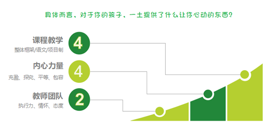 在这些家长所认为的“一土与原学校最大的不同”里,暂且不论及“尊重孩子天性”“培养孩子解决问题的能力”这种有一定的高期待的内容,但诸如“作业交给老师(而不是家长)负责”“师生间更多互动”“老师对于教学的投入”,我们以为其实应该是大多数学校的常态。注:问卷信息——样本总数:9;分布年级:一年级2,二年级1,三年级6;问卷统计(有多选项)。虽说这些家长接触一土时间并不长,对一土的很多课程都还没有深入的体验,加上刚刚进入新的集体,面对一土这种“以教师为中心的学校”——学校将教师与家长的微信沟通屏蔽,仅通过晨犀软件搭建非实时的沟通,使教师可以全力地投入在教学与儿童引导中——新家长们就“家校沟通如何能进一步保证交流效率”的问题,在问卷中也给出一些建议。除此以外,我们从问卷中可以看到,家长对于一土其他呈现出的故事,都还在兴奋地观察与体验中。我们结合日常家长的表达与这次的问卷,带大家一起分解一下这个谜底——这些家庭之所以愿意承担更高的机会成本(相对有实际已毕业生评估数据的学校而言)、交易成本(相对固守在原校而言)和货币成本(相对公立而言)来到一土,应该是基于以下三个原因:价值观正、教育设计的思路和逻辑以及落地执行到位。对于那些未来教育路径尚未清晰锁定某种出口的家庭,在所有这种以部编教材+教育创新的学校中选择的家长,无论公立或是民办,如果任何学校以上这三点有了偏颇或不实,我想每位家长都拥有用脚投票的权利。我们也希望更多的、甚至所有的学校都能够做到以上全面的发展。