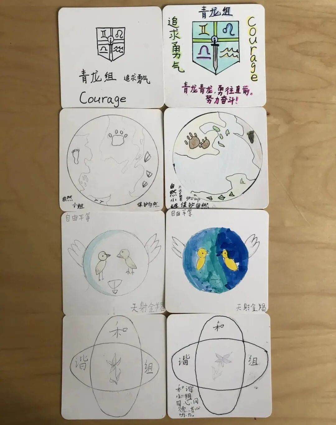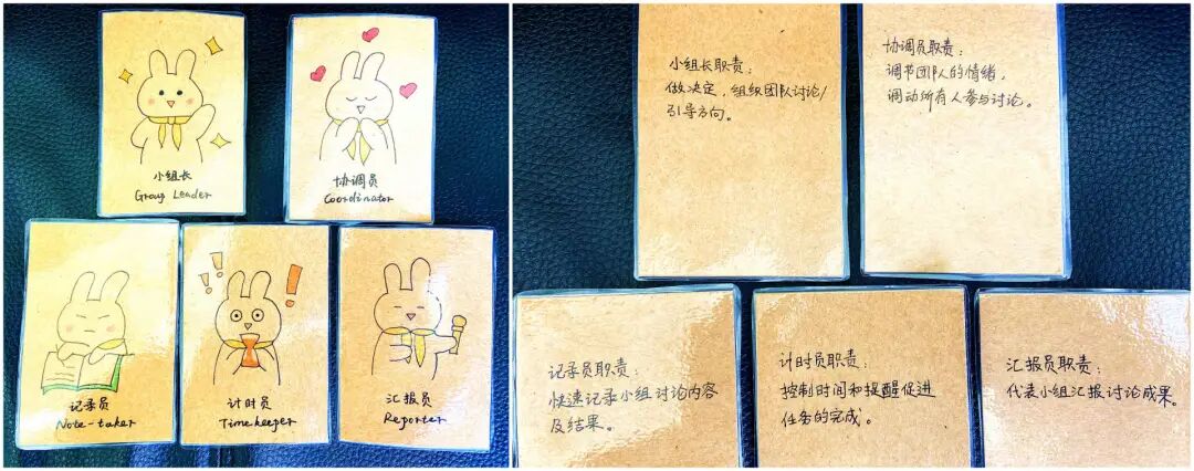 在小组合作中,分工是最容易产生张力(当现实与期待不符就会产生张力,本身是个中性词)的部分。为此,老师们让新组成的小团队先一起讨论设计小组分工职责的合作卡牌,这个仪式让小组合作的分工有章可循,大家可以时刻提醒自己的职责是否完成,再对他人给予友好的帮助。