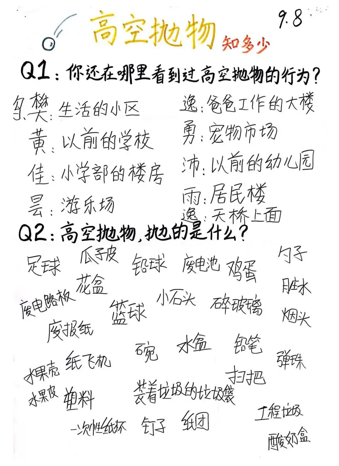 家委们都就此出手采取了很多沟通行动,但小问题并未停止,“洒洒水”“落落衣”的事件依旧上演着。显然,”有挑战”与”真实性”这两点已经非常完备了。如此一来,大家不由分说,一致同意在四年级上学期探究高空抛物项目——“头顶上的烦恼”,这也终于完成了小土豆们记挂已久的事。“总有人高空抛物,我们该怎么办?”顺着这个问题想下去,接下来,不就是解决问题嘛!可如果想深入地探究,只有这样一个驱动性问题还不够。因此,着手解决问题之前,小土豆们先要: