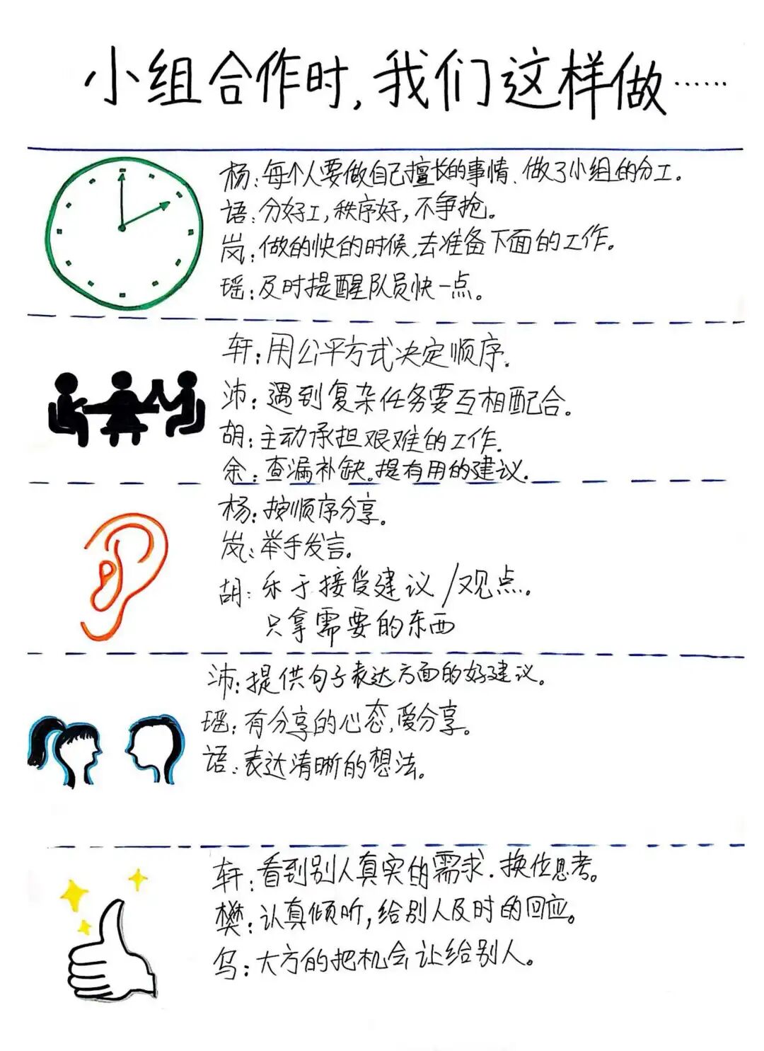 孩子们通过两轮讨论、迭代最终确定的小组合作公约:
