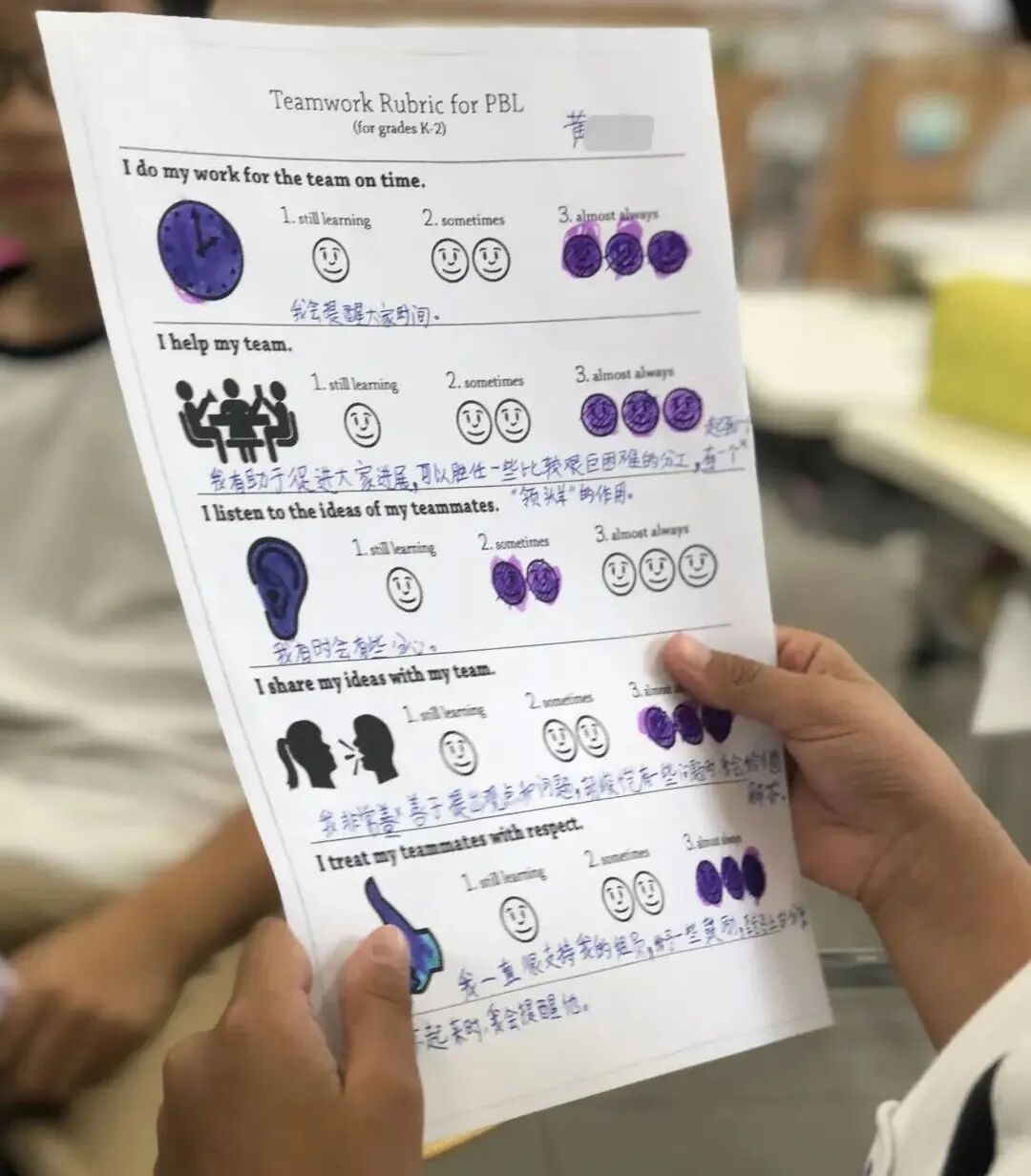 而每次实验和采访后,老师们都会带小土豆们反思小组合作的情况,借助量表自评、互评,孩子们自己表达、讨论,达成共识,通过这种方法全班一起总结出的合作经验,将真正内化在孩子们心中与行动里。