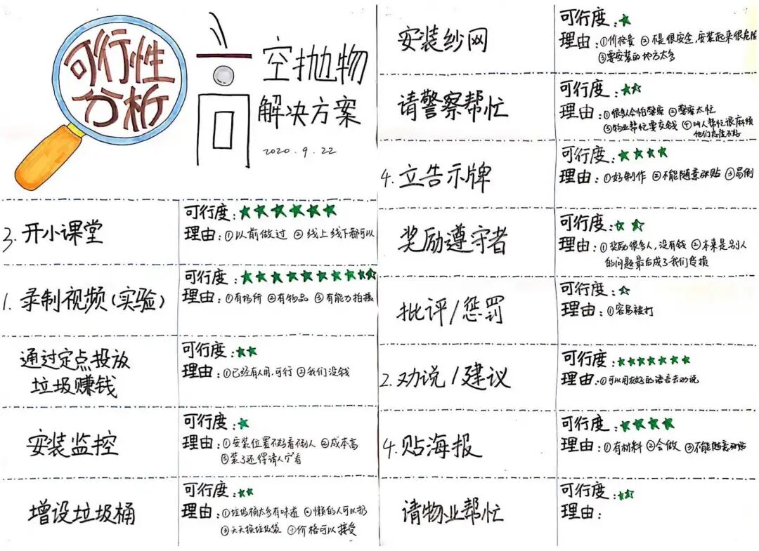 基于上面这些讨论,孩子们最终确定了大家能够一起完成的解决方案:拍实验视频、开小课堂、海报/告示牌、倡议/劝告。