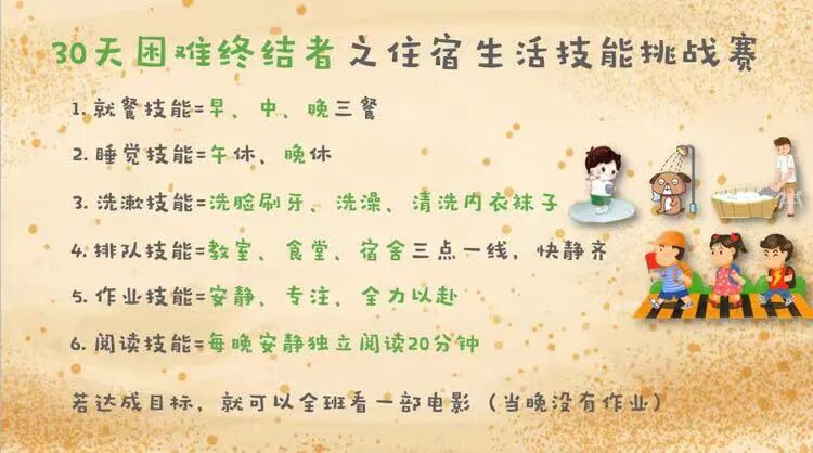住宿生活对于小学低年级的孩子是个不小的挑战,即便再有意识培养生活自理能力,也不可避免地要在开始住宿时学习不少新的技能。孩子们情感与思维铺垫好了,怎么帮助他们真实地解决眼前具体的困难,也是很关键的一步,不要功亏一篑,让他们在挫败面前再退缩回去。一土娃很习惯的儿童技能教养法(广州一土:一年级的娃,华丽变身行为教练!)又隆重登场了,命名和定义技能+及时反馈+共同商讨庆祝仪式,孩子们自己就上道了,所以开始的时候铺垫好,并不需要老师每每追在屁股后面靠凶靠吼。