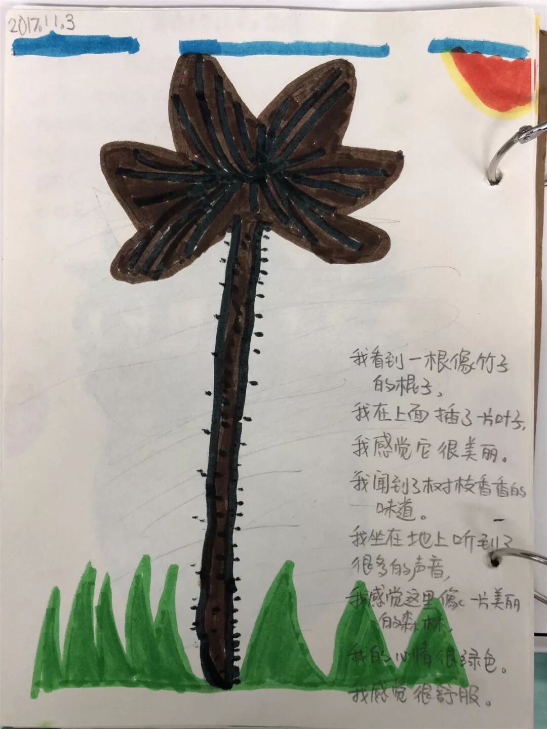 从山上走下来,孩子们在石阶上席地而坐,开始了他们最喜欢的自然笔记。经过了一年的时间,木棉班的小土豆已经能很自如地记录自己当下的感受,也能更敏感地捕捉到自然的细节。