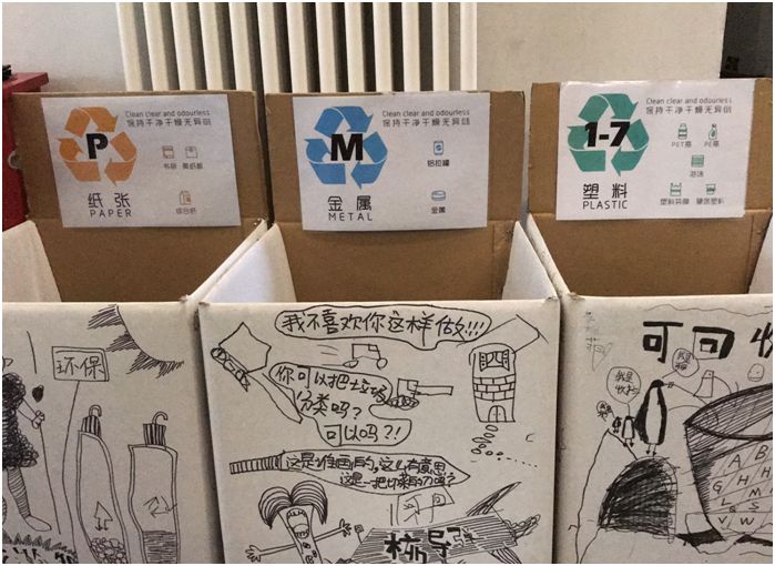 公共走道有了足够明显的标识,连K年级(5-6岁)的“小土豆”都知道将水瓶投放到回收站或者班里的回收袋,不少“小土豆”还会主动将家里的一些可回收物带到学校或者小区的分类箱。经过一段时间的倡导,师生的环保意识都有所提高,就打印纸这一项来说,利用率比从前大大提升——打印首选双面打印、单面空白的将再次打印或作为孩子们的草稿纸和画纸、双边都用过的打印纸用来做手工或者直接回收。而在以前,这些没有充分利用和错误丢弃的纸张早早就结束了自己的生命,被填埋或者被焚烧,没有充分体现ta的价值。