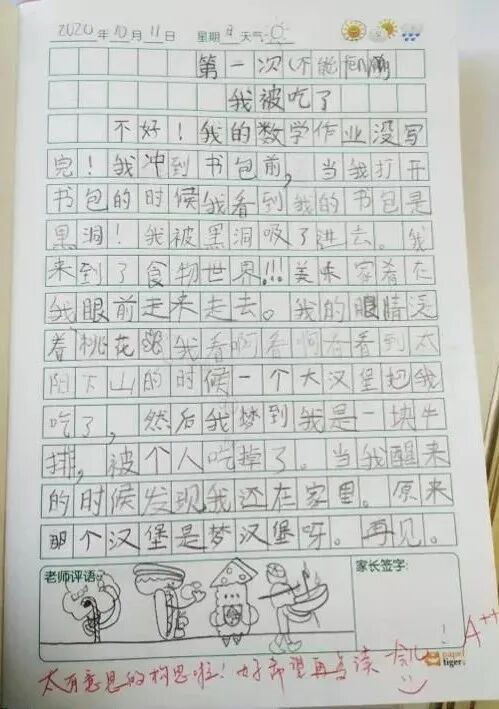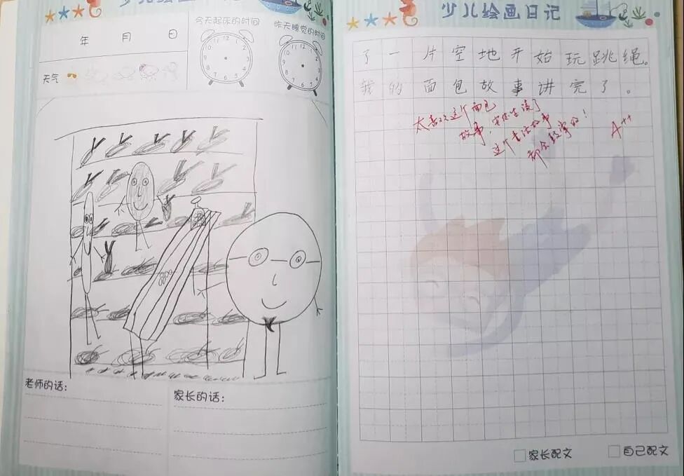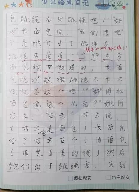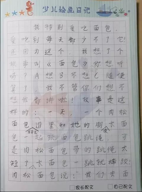 第一篇小童话是一次大胆的尝试,里面运用了拟人的方法,把她爱吃的食物赋予了生命。看似写的是面包童话,其实写的是她自己对跳绳活动的喜爱,以及与同伴友情交往的日常画面。三年级的娃第一次能写出这样的小童话绝对值得称道。
