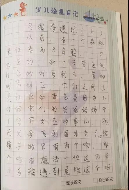 前一篇向安徒生致敬,这篇《乌鸦奇遇记》则立刻转粉J.K.罗琳了。哈利·波特变身为两只乌鸦兄弟,伏地魔对哈利的一路追杀演变成了乌鸦兄弟们对女巫的讨伐计划,文章结尾还为后续打下了伏笔留足悬念。闺女希望把乌鸦兄弟的故事一集套一集地写成一个“长篇”连续系列,甚是期待呀!