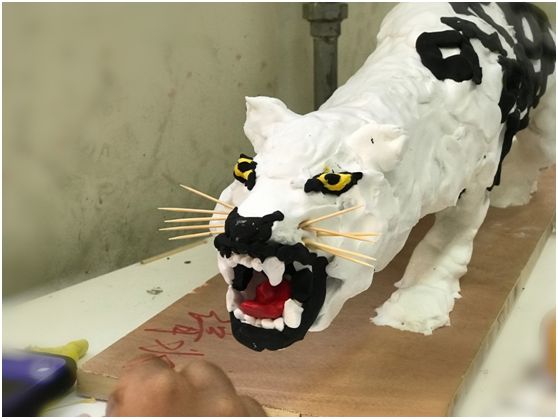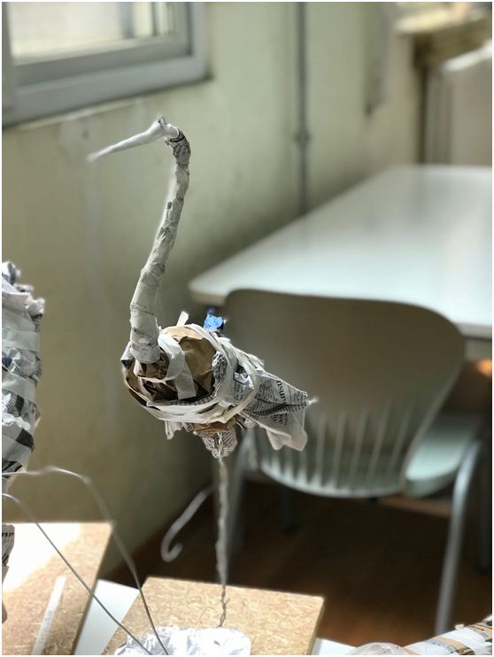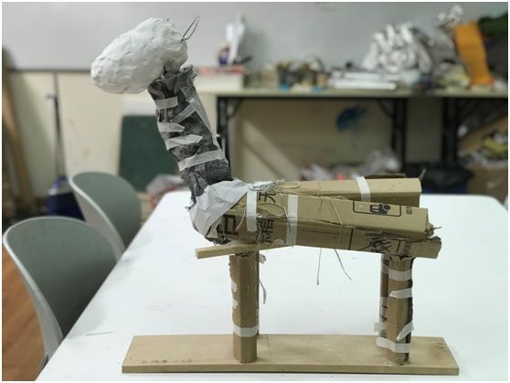 由此,从纸上的草图到物态化的作品,孩子们经历了不断探究、试错、优化的过程。这个过程历时三个月,涵盖思维导图的梳理、对生物的描绘、材料的领用、骨架的搭建、主体的完善、环境的创设等等。其中,每一节课的每组都需要产生一份工作纪要表,帮助孩子们建立有序的工作方法,梳理要点、总结经验、推动项目的进行。