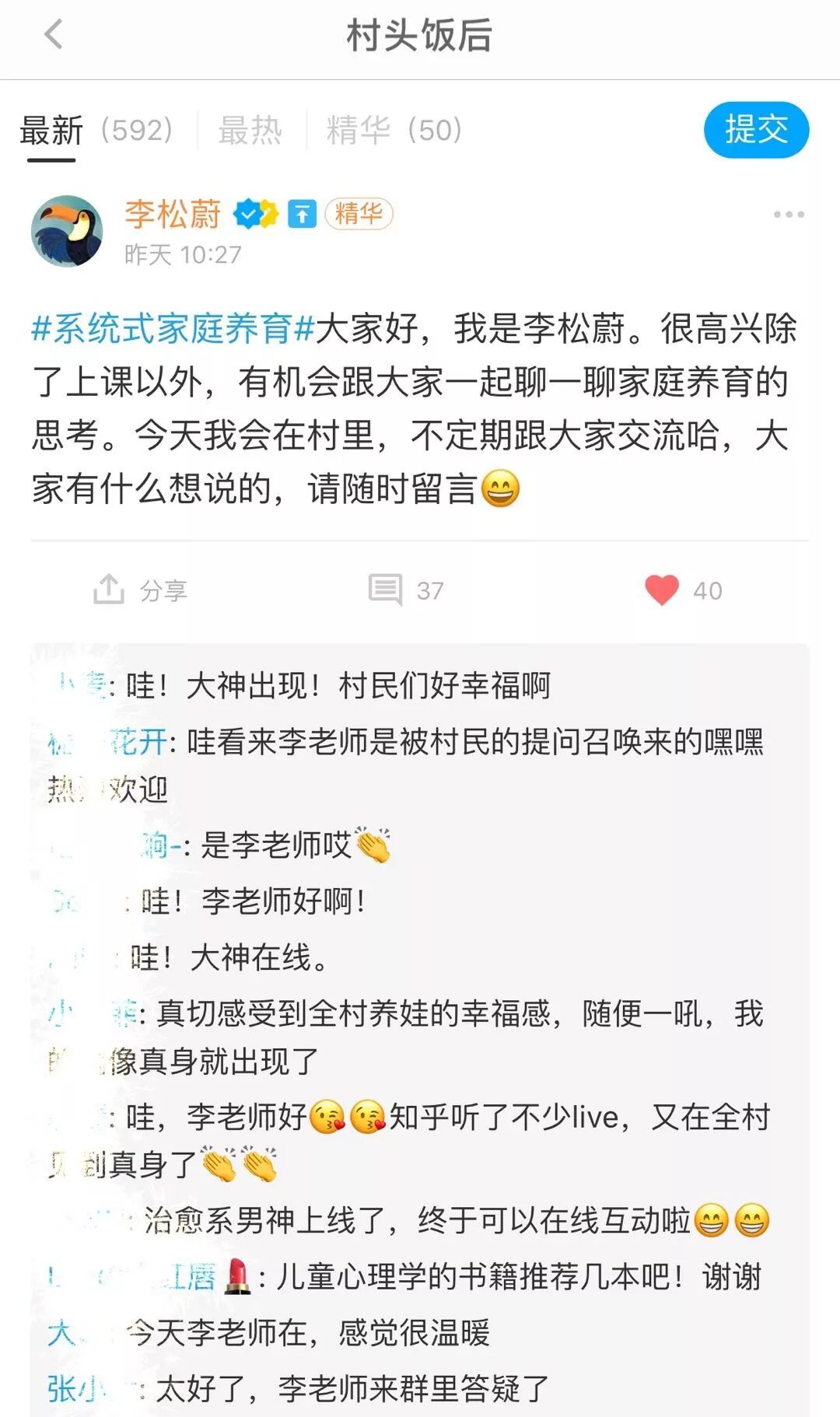 村里有多门大咖的免费课程,包括一土学校给家长的私享课,一土美育课,以及会定期邀请资深教育大咖,与村民互动交流的「村头饭后」栏目——李松蔚老师将作为全村社区「村头饭后」栏目第一位嘉宾,每周四驻村回答大家提问正在进行中!