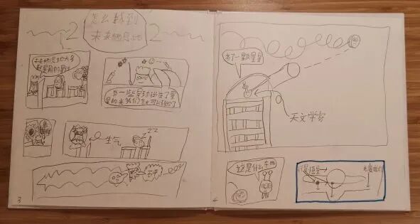 这张漫画是学校里一个小小的项目的成果,绘制科学漫画。在这张怎么找未来栖息地的图画里,果果画了天文学家利用行星在围绕恒星运行时会周期性地遮挡一部分恒星的光线,所以可以利用恒星的光变曲线来寻找地外行星。