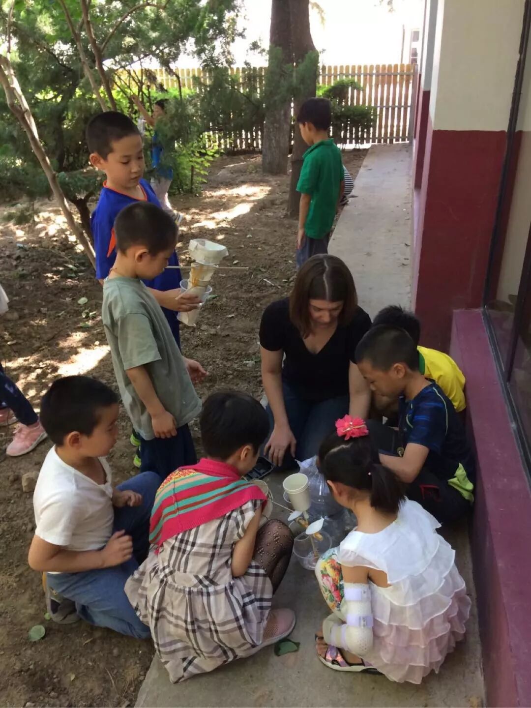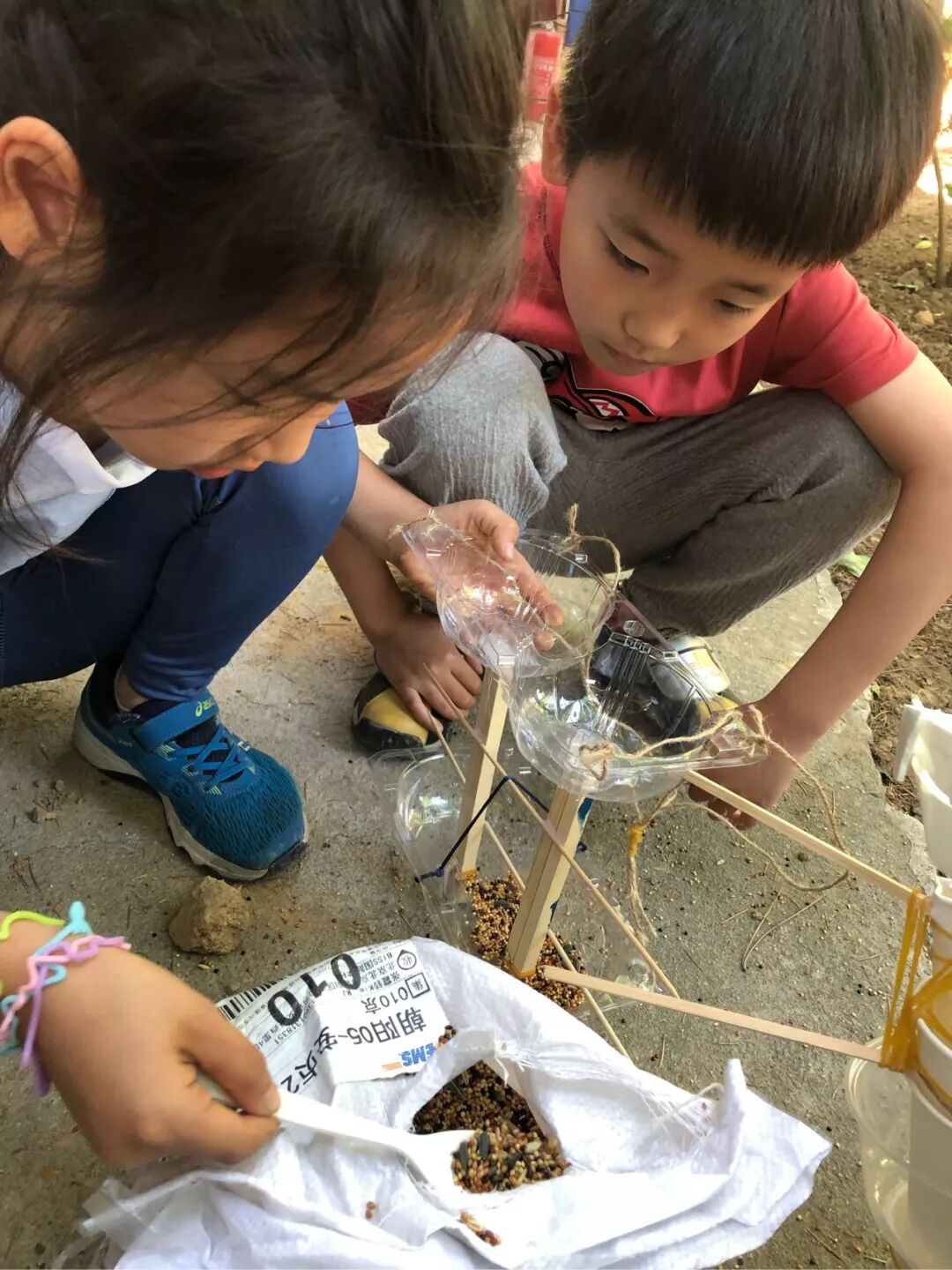 ▲孩子们与英文老师一起,设计并建造喂鸟器(bird feeder),以吸引更多的鸟儿。