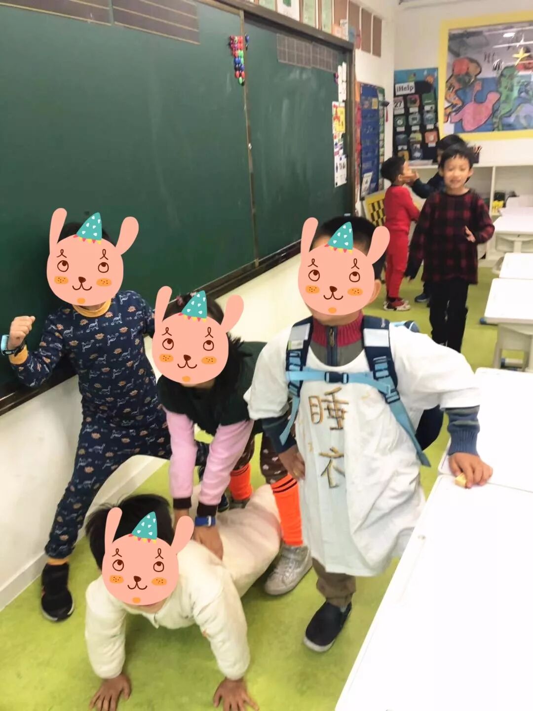 然而在睡衣日当天,小动物连体装、毛茸茸的睡袍、简单粗暴的秋衣秋裤,还有自制的超有创意的印着“睡衣”字样的“爸爸牌T恤”等各式各样的睡衣,游走在校园的角角落落。连老师们也抛弃了羞涩,穿着真的睡衣和孩子们一起奔跑、嬉戏。