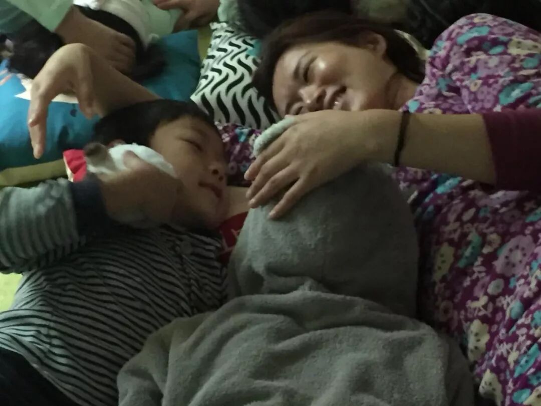 ▲休息时间,孩子们和老师穿着睡衣躺在一起,像在家里一样