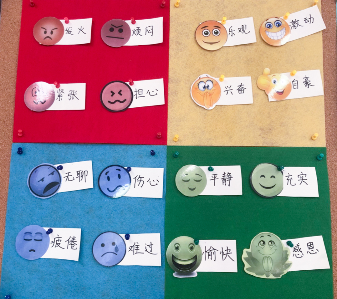 情绪卡片是一土入学以后每个孩子都要掌握的技能,这有助于孩子形成良好的自我认知,(请参见文章→《给你五条船,划向“我是谁”的彼岸》),一二年级的孩子每天刚开始的时候,老师会带着他们认识自己的情绪四象限,并学会在每个情绪中的调节方法。