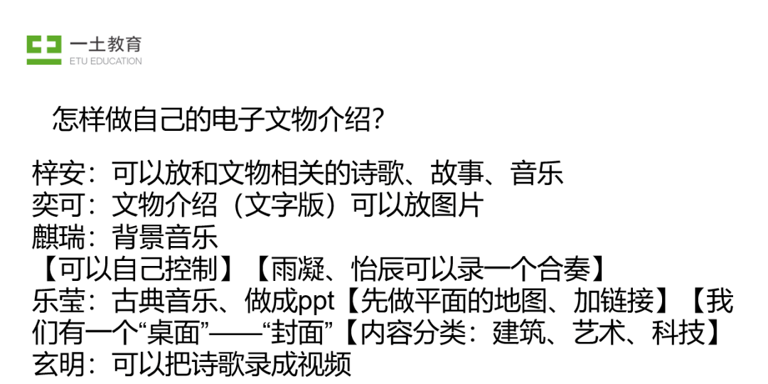 与线下的学习相比,孩子们在线上一起学习的时间要缩短了不少,但老师们实际上是“留白”了大量的时间,引导孩子们在线下实现充分的自我探索与自我管理。回溯整个课程的过程,“以学生为中心的学习”无处不在。“虽然这个项目制学习的课程内容及产出(数字博物馆)是由老师主导设计的,但整个过程,其实是在和孩子一起,站在孩子视角,去试图回答三个问题:我们需要学习什么?老师们给予了我们什么?如何成为更好的我自己?” 一土三年级数学老师赵老师如是说。在这个过程中,老师们的角色已经从传统的“授业解惑”,转变为“引导者“、”支持者“和”教练”。孩子作为学习的主人的出发点和落脚点,在项目过程的每一个阶段都得到了充分的彰显。 孩子们和老师脑暴文物备选单,根据自己的兴趣,决定他们即将进行深入探索的文物 链接真实场景,根据孩子们去过的博物馆,来设计自己的数字博物馆导览图和文字说明