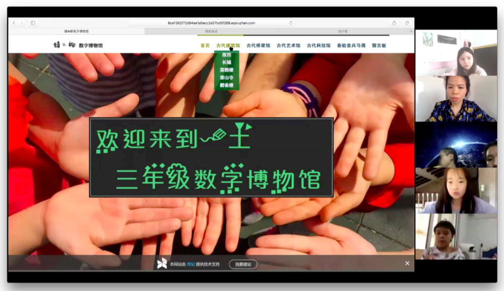 接下来,同学们要做项目展示规划设计和内容填充。通过与伙伴们一起讨论,观摩其他同学的设计和样例,大家分组合作或独自承担了各自文物馆的内容资料的准备工作。学习共同体就这样悄然发生了。项目结项前的最后两周,一场“网页制作”的风潮在三年级学生群悄然兴起,孩子们的微信上“惊现”各种网页制作“互助小组”,还无师自通地开起Zoom电话会议,共同探索平台使用。而在线上课堂的课间时间,孩子们也会在老师的引导下分成好几个小组,由小老师带领大家进行网页制作的线上讲授,帮扶计划开展的轰轰烈烈。