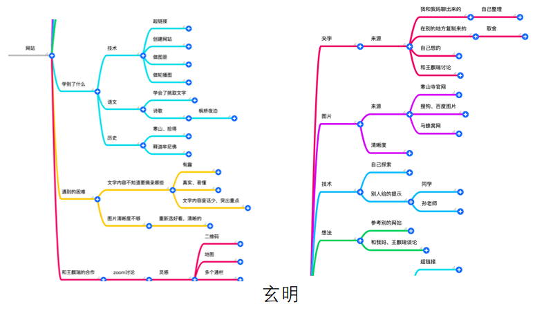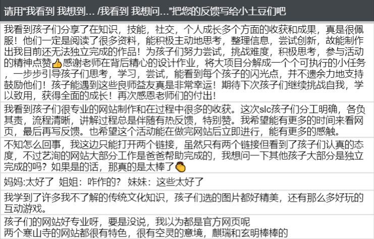 在热热闹闹的互助学习中,孩子们自己搭建的网站陆续出炉,所有的功能、内容与呈现都是自我探索的结果,老师们所做的,就是给出一个“观众”的反馈和迭代建议,或者提供一些相关的知识与资源。这两个月在语文课、数学课学到的知识,也因为这个网页实现了各种连接。