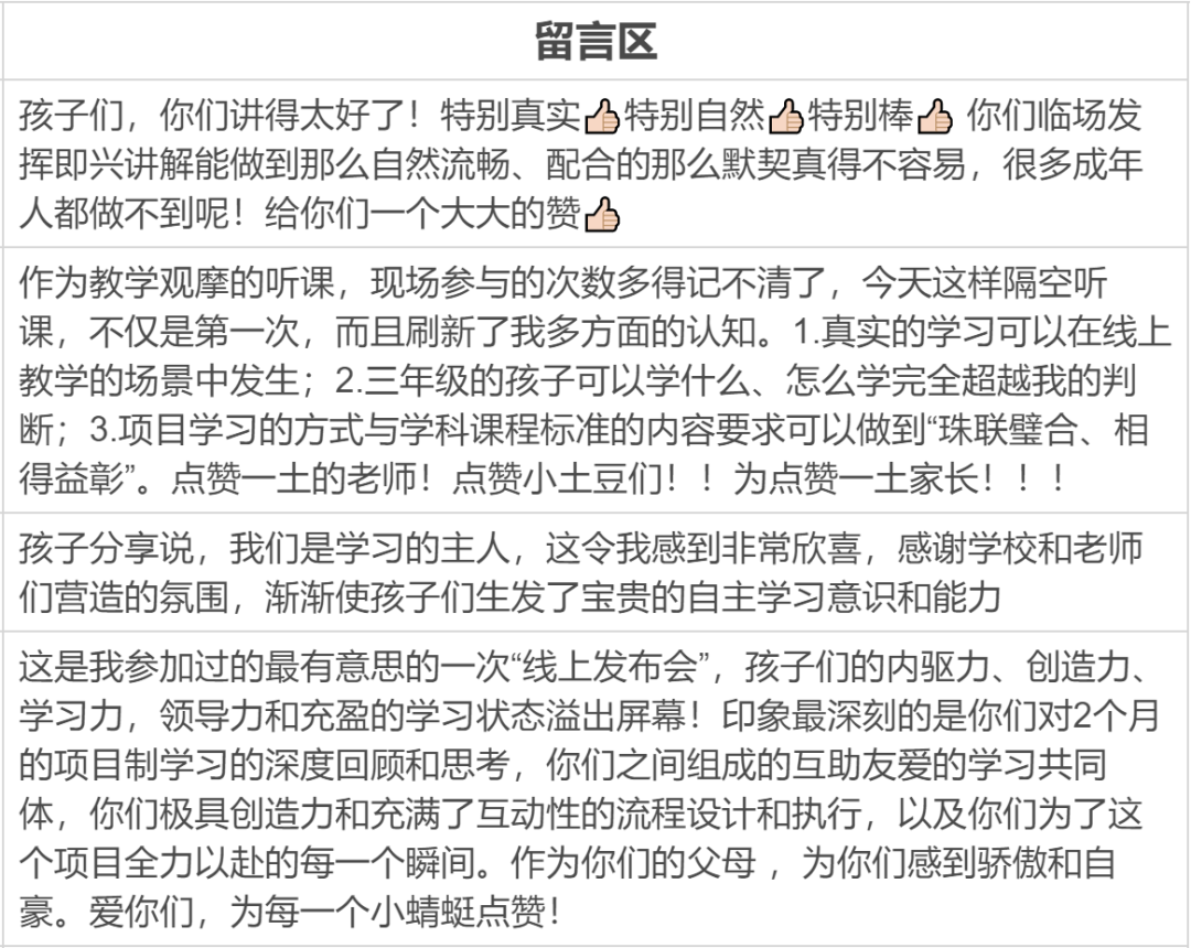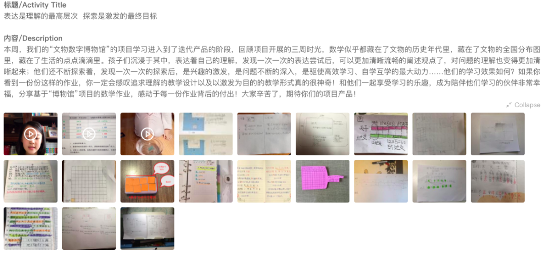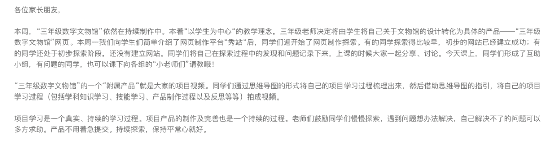 如果用一个词来总结这个“数字博物馆项目”,那应该是“成长”,有孩子的成长、每一个孩子都在这个过程中尽自己所能去主动探究和学习,学会面对海量的信息不断搜集、筛选、归纳、内化,学会与小伙伴更密切的沟通与协作,学会从伙伴与老师的反馈中不断完善自己,学会总结收获,成为更好的自己;有老师的成长,在探索网络教学的过程中,不断尝试围绕教学目标,进行内容和方式的革新,与孩子一路同行;也有家长的成长,跟随这个项目,学会放手,更多看见孩子、相信孩子。随着今天文章的发布,三年级数字博物馆的网页也正式上线了。就如学习将注定是一个持续不断的过程,这个数字博物馆也必将是一个动态的不断完善的项目。就如三年级的许老师说,“在这个过程中,我们真切感受到孩子们的学习热情和自主学习能力,这是我们共同学习成长的过程,作为老师,我们也非常享受这个过程。也许过程中还会有各种不尽如人意的地方,但那是孩子们最真实的状态,正因为有一些“裂缝”,我们才会见到孩子成长朝向的光。