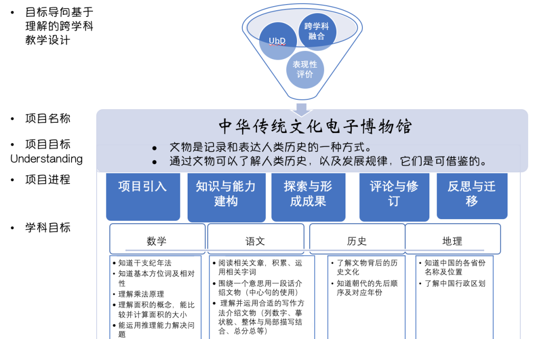 项目制学习是在一个真实情境中,激发学生的内驱力,打通学科间的边界。在老师的引导下,尝试通过沟通协作,完成与项目相关的知识与能力的构建,并迁移习得解决真实世界问题的过程。回到“数字博物馆”的这个项目,为了帮助同学们理解“文物是记录和表达人类历史的一种方式,通过文物我们可以了解人类的发展规律“,三年级老师们基于UbD课程设计(Understanding by design,基于理解的课程设计)理念,共同确认预期的学习结果,从而以终为始,在项目实施过程中围绕“知识与能力建构”设计了一系列教学活动。这些“知识与能力建构“包括了解文物的历史背景、了解文物所在区域及文化背景、运用合适方法介绍文物、了解文物年代背景、会用合适的年代词描述等等。而“数字博物馆”作为老师们选用的表现性任务,也是这个项目中最重要的评估方式,通过前置任务,老师们得以在真实的教学活动过程中,落实教学目标。