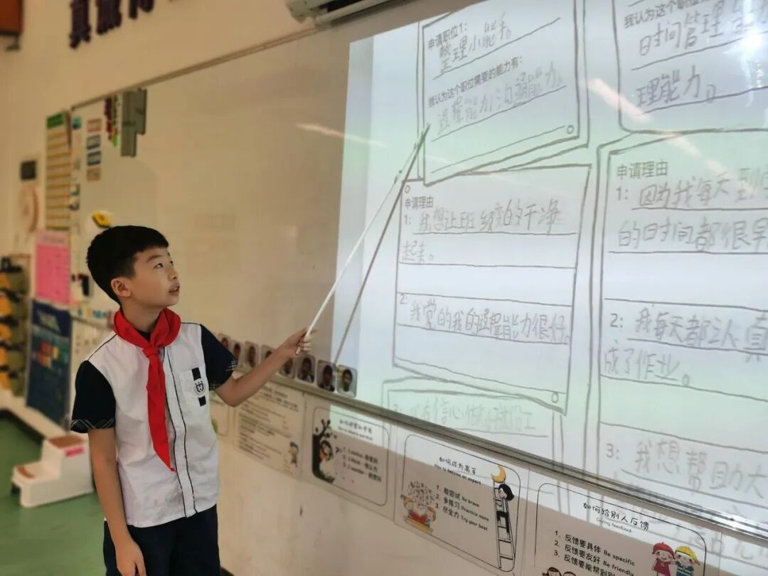 孩子们在周末时根据老师设计的任务单,填写两个想应聘的职位,并分别书写自己认为这个职位所需要的能力以及自己应聘的理由。每个人要拿着这份完成的申请书,上台大方自信地分享自己想申请的职位,勇敢地面对大家和自己,等待大家的投票结果。