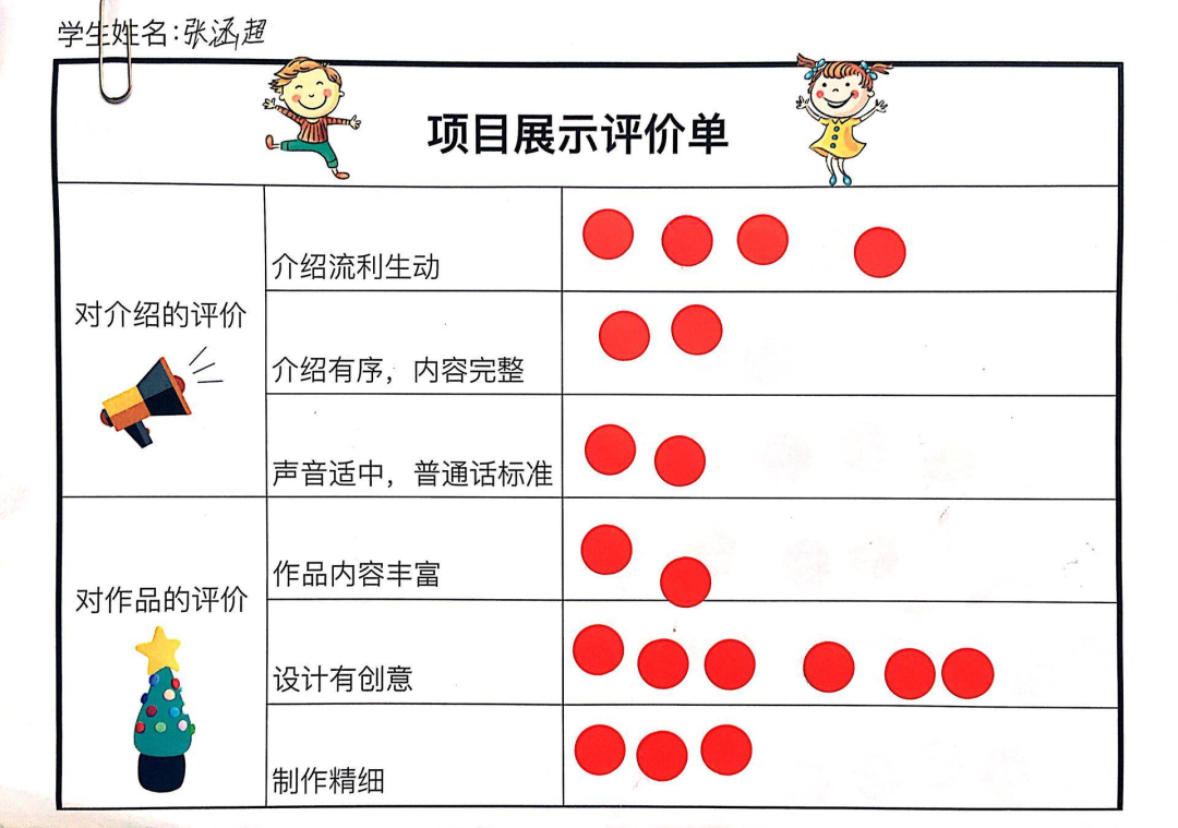 下面是项目展示日的评价单,这种评价单相对具体建议而言,更有激励意义,孩子们会努力地希望获取更多的认可,也下意识地从这几个不同方面去提醒自己。
