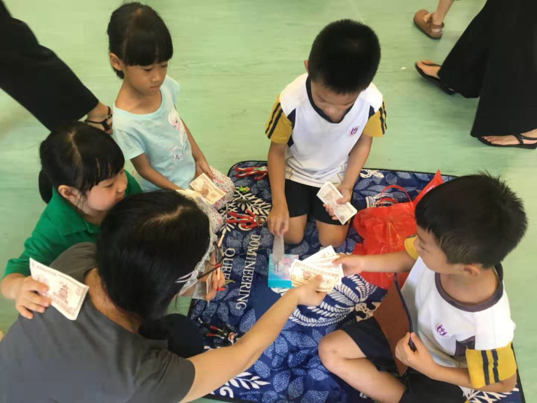 ▲ 几个一、二年级的孩子在一土市场交易物品,老师也会作为普通顾客参与其中大家可以看到,往常我们常见的贴纸、小红花所对应的表现激励(主动举手回答问题,不论实际价值;多阅读;善于倾听;工整书写等等),并没有在豆子激励体系之内,之所以将表现激励和贡献激励区分开,原因在于贡献激励最后可以兑换成钱币,钱币是通过有价值的行动或想法得来的,并不是因为你的表现好得来的。