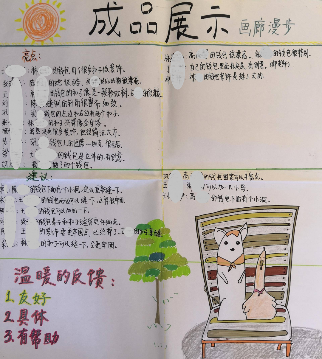 在一年级孩子的第一个钱包项目中,产品设计时,孩子们第一次练习画廊漫步,给彼此反馈。老师特意要传授如何做出温暖的反馈——友好、具体、有帮助。这也将贯彻于他们六年的项目课学习。