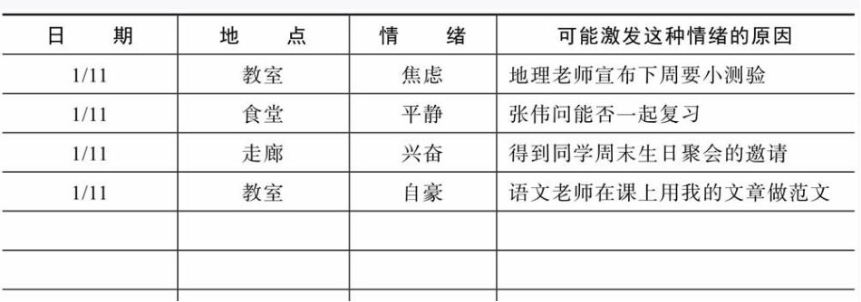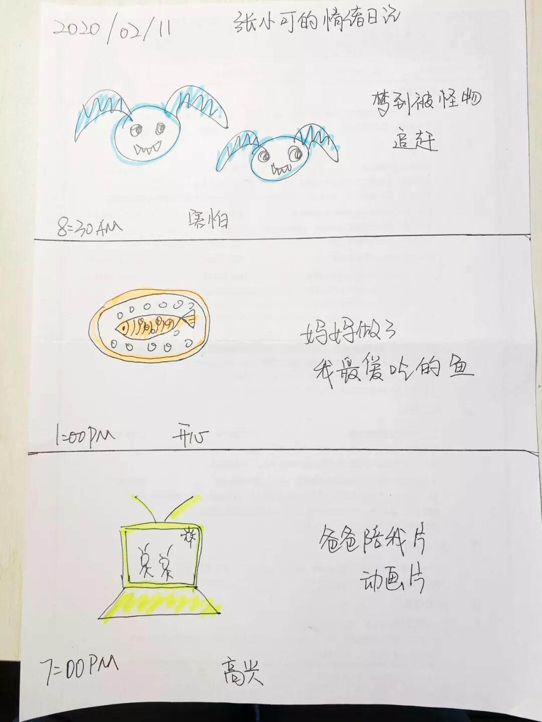 ▍ 情绪日记 是孩子们很喜欢的表达方式之一。孩子们可以自由设计喜欢的日记形式及对内容进行装饰。用笔记本/纸记录自己每天的情绪,也可以将每个时段(如:早上-下午-晚上)的情绪词语写下来,并简单画出对应的事件,加上一句描述,每天晚上可以跟爸爸妈妈分享今天的情绪日记。