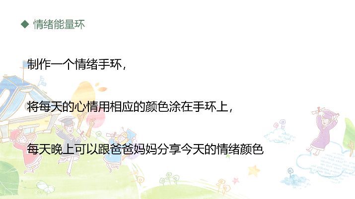 ▍ 情绪能量手环 是更简单的情绪表达方式,对小孩子来说也不困难,鼓励您的孩子将早、中、晚的心情颜色分别画在手环上,让孩子感知、记录、分享自己的情绪吧!