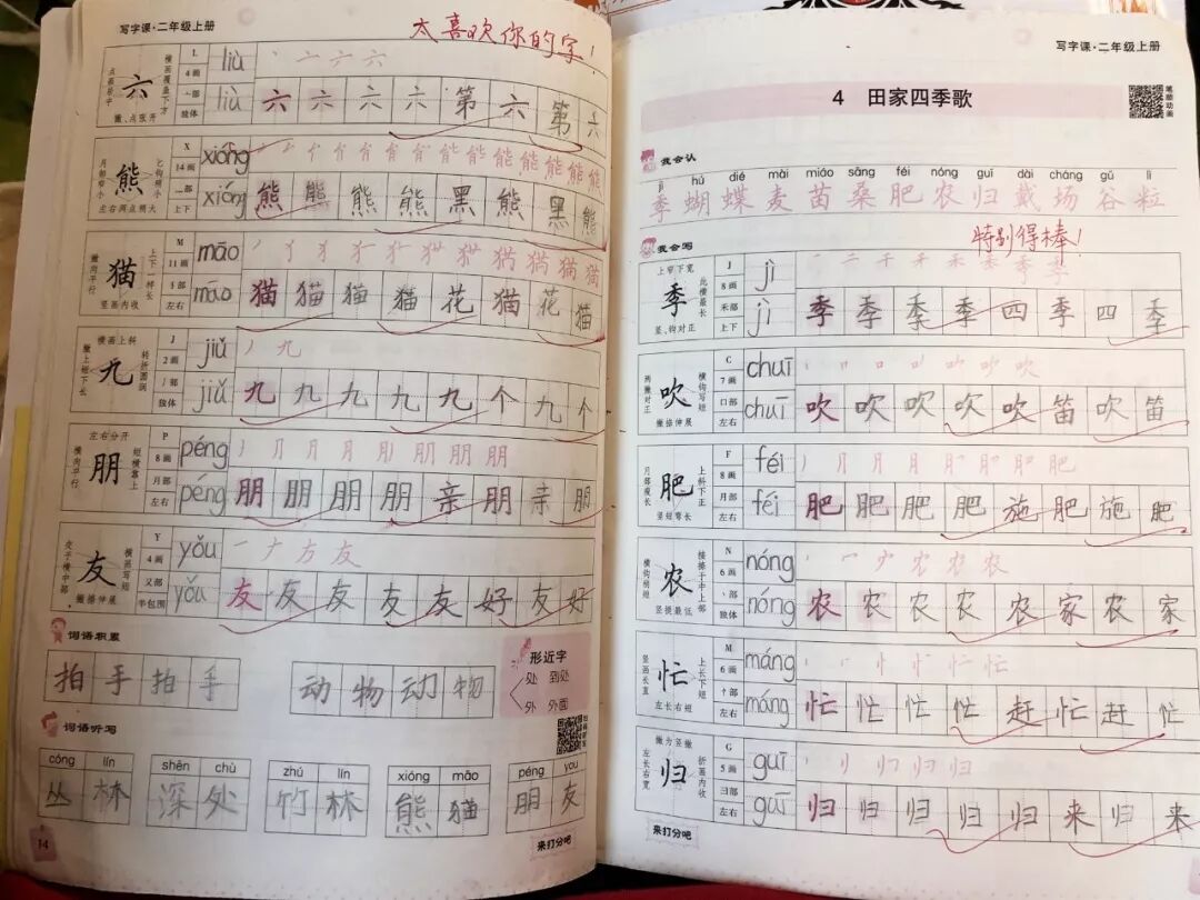 这样每次他都能很快做完作业。我只看一下他写的字,其他不看。看到特别难看的字,我就问他,“是想混里头得了呢,还是改一改?”他要是说“算了,混着吧!”我也挺高兴的;他要是说“想改改”,我一样挺高兴的,就教教他怎么写才好看。我跟他说过好多好多遍:“字如其人,直见性命”,他不怎么理解,但我还是总说这句话,总有一天他会明白的。