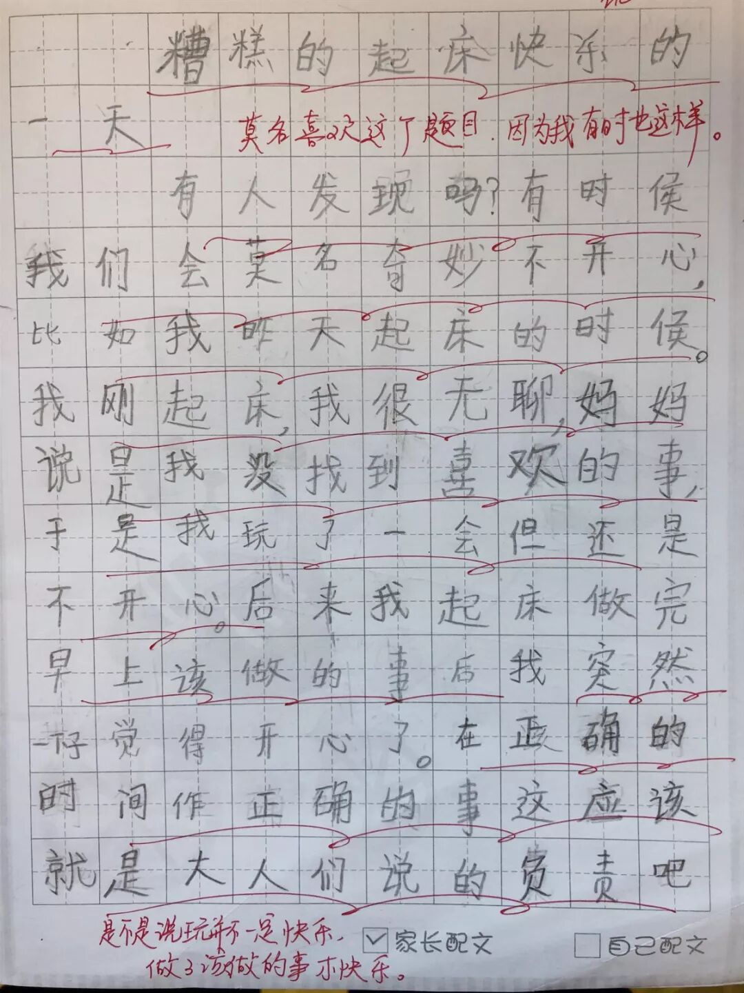 像这样对付了一段时间,他又会反复出现实在不想写的情况。我一般都很有耐心,这耐心出自于我心里真的不焦虑:他不写作业,我不焦虑他落后于别的同学;他完不成作业,我也不焦虑老师和同学们对他的态度。我会引导他自己体会思考这事的前前后后,如果他一直不写,我会一边等他一边引导他。
