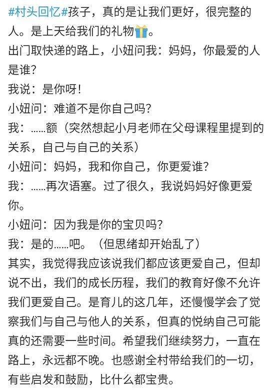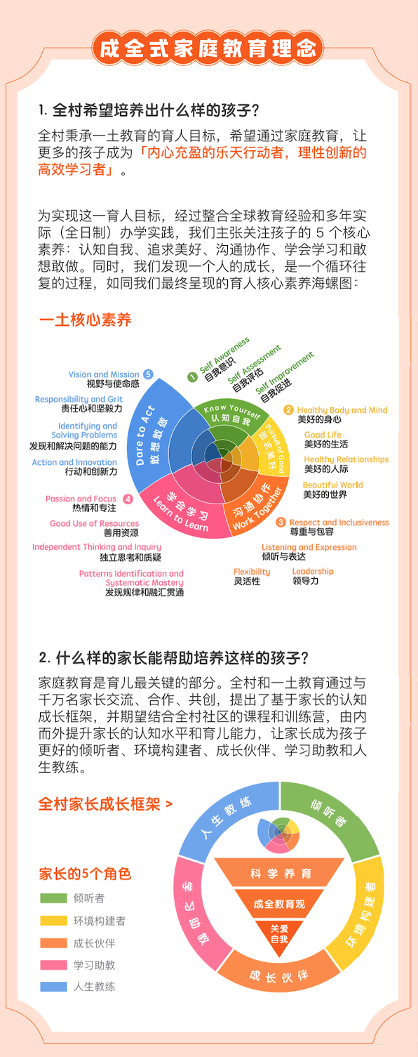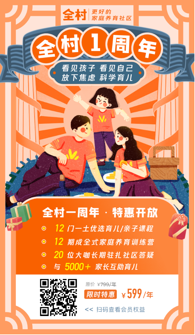 全村问问:全村邀请了 20 位嘉宾入驻社区,全年陪伴,一对一回答村民提问; 村广播站:育儿百宝箱,每周 4 期音频,利用碎片时间掌握育儿理念和技巧; 家长锦囊:每天一个育儿小行动,日积跬步,滴水穿石。相信时间和习惯带给你的改变; 成全式家庭养育系列训练营:每月 1 个主题,全方面提升你的科学育儿能力。