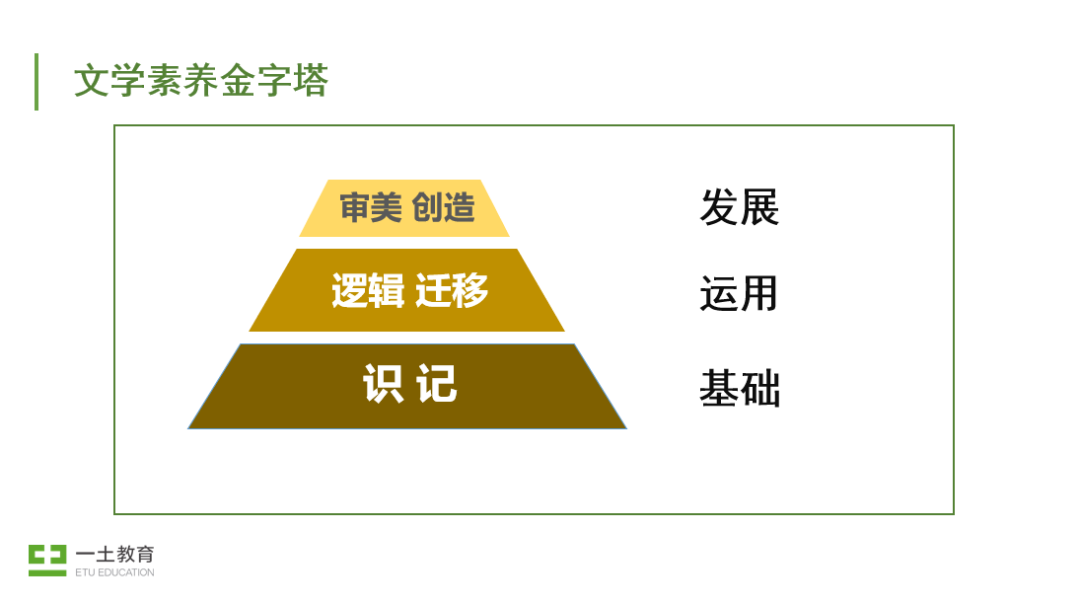 因此,中学语文设计最基本的还是语文底层能力的构建。我们要培养孩子们语文基础、运用、和发展能力,对应的就是识记、逻辑迁移和审美创造,这个是我们的文学素养金字塔。为此,我们要立足四个要素:感知、积累、联系、表达。植根三个维度:自身、作品、生活,最终实现三个层面能力的全面提升。