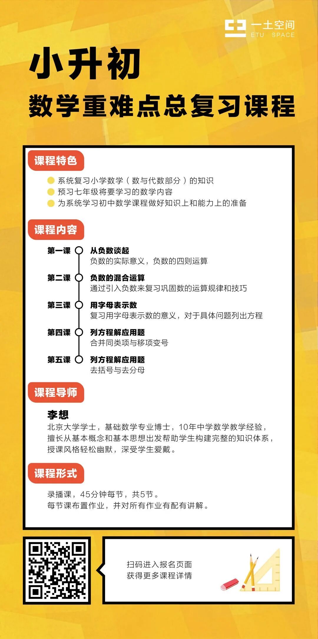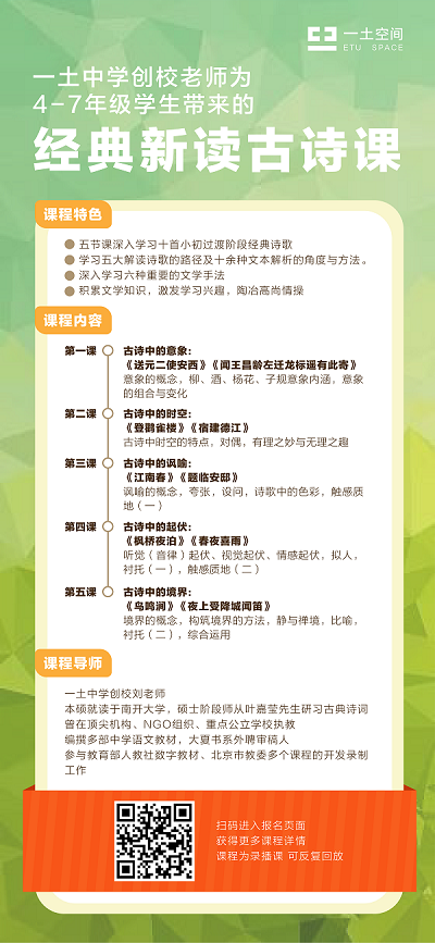 最后想和大家说的是,虽然这段时间孩子们只能线上相见,少了些(学生和老师、学生和同伴之间的)情感连接、社交体验和练习、人与人之间的互动、交流、启发。但这方面的差别,家长们不用太担心,让我们用温暖的家、用无间的亲子关系给到孩子们别样的滋养吧。现在在家,孩子们感受关系、感受爱,完成基本教学练习,开学后,经过短期调整,孩子们的状态会很快恢复,会更强劲地生长。如果您的孩子正处于小升初4-7年级,为避免下一个学习阶段中的不适,可以利用好这段充足的时间,让孩子在牢牢掌握好小学阶段知识的同时,对初中即将接触到的新内容形成较为系统的认识,逐步过渡到未来的初中学习。一土中学现已推出适合小升初过渡衔接的两门线上课程。课程将从小学六年级学习的负数这个概念出发,通过对小学知识的梳理与再认识,逐步过渡到一些初中数学的知识内容,来帮助同学们更好地完成小升初衔接阶段数学课程的学习。(参见文章:《小升初数学重难点总复习课程 》 已上线)课程以五大主题为线索,十首核心诗歌为依托,精选适宜小升初过渡阶段的名家经典作品,涵盖六种文学常用手法,透彻讲解核心概念,重视讲授解读古典诗歌(文学文本)的方法,力求在五次课内让学习者感知古典诗歌的佳处、奇处、妙处;读出古典诗歌的深度、广度、高度。(参见文章:只用标准答案来衡量一个人的文学素养,是远远不够的)