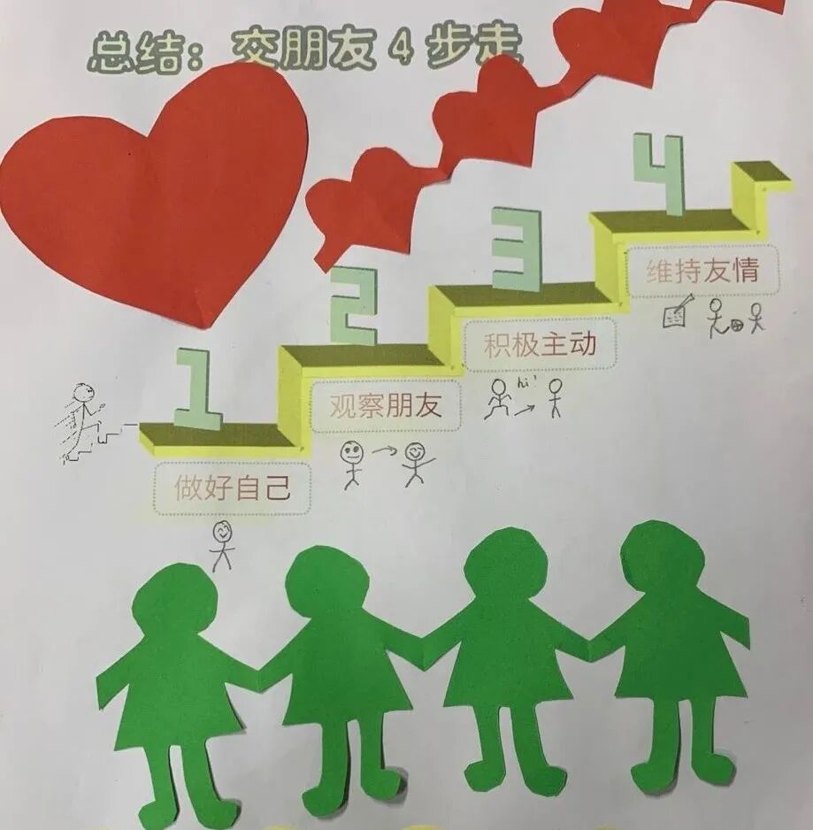 一土的老师除了带领小土豆从绘本中体会友谊,还会教给他们实用的操作步骤,K班的小土豆们就在静静老师的带领下开启了一场“如何交朋友”的魔法之旅。暖冬的课堂上,静静老师从小叮当的百宝袋里拿出来了一张字条,这是什么意思呢?“这是交朋友4步走,因为是楼梯,还有写着1,2,3,4。”下面让我们去静静老师的课堂学习以下交朋友的4个锦囊吧——